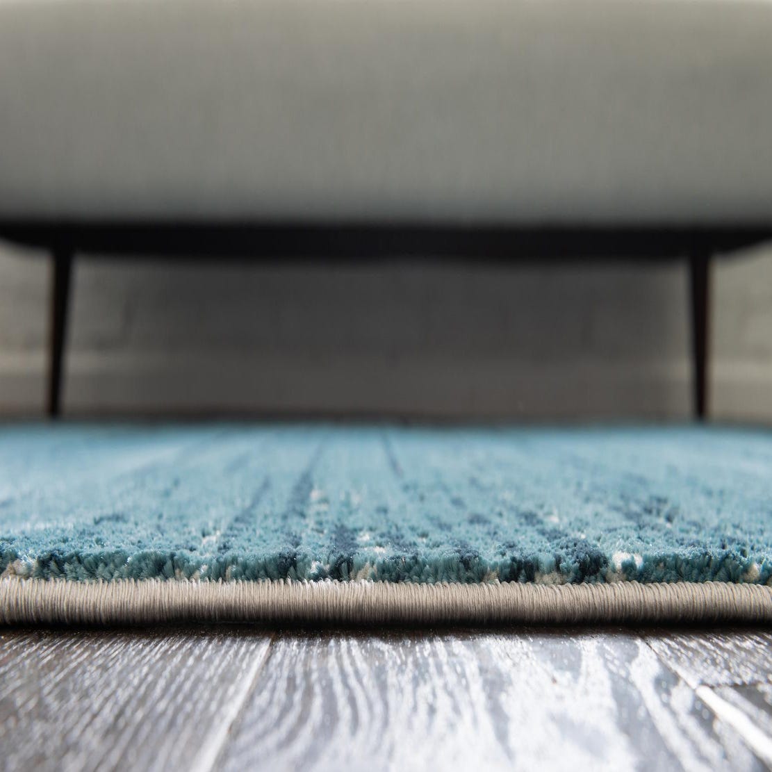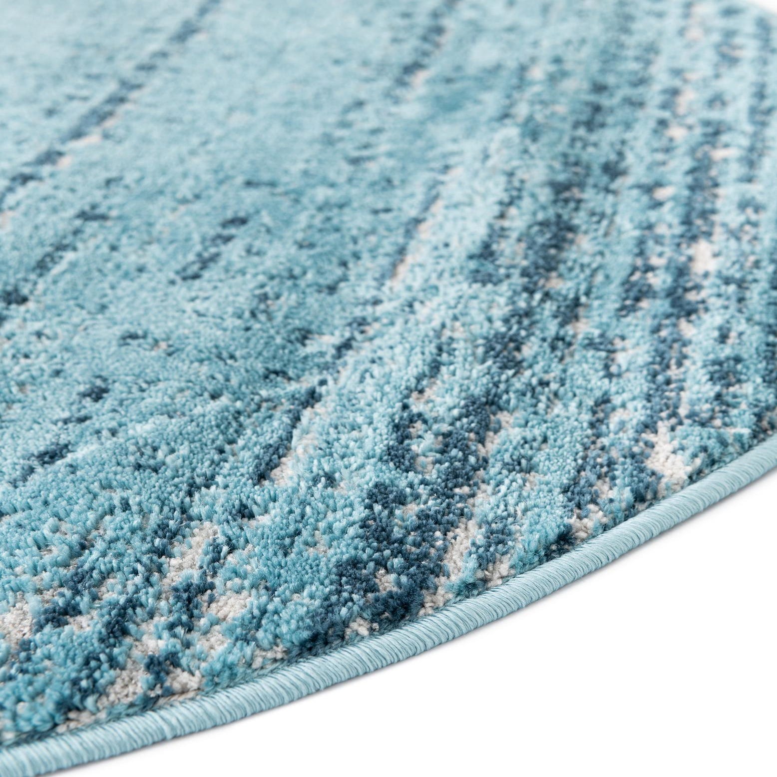 The oval shape works well in transitional and contemporary rooms—place it beneath a round dining table to echo the silhouette, center it in a living area to anchor a seating arrangement, or position it at the foot of the bed to introduce color and pattern. The blend of blues with gray and ivory accents pairs nicely with warm wood tones, crisp white furnishings, or coastal-inspired décor, making it a versatile option for many interior styles.