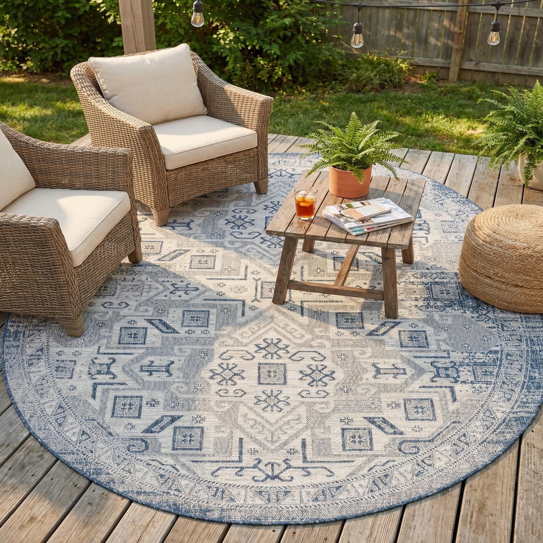 Machine-made of 100% polypropylene and designed for outdoor use, the rug has a low-profile, tightly woven texture you can feel when you run your hand across it — firm underfoot with a slight ribbed weave. It works well on a covered patio or sunroom, under a round bistro table, or layered beneath wicker seating with navy and ivory cushions. The blue-and-ivory palette also complements coastal, modern farmhouse, and transitional interiors where you want a grounded, patterned anchor that reads as casual and collected.