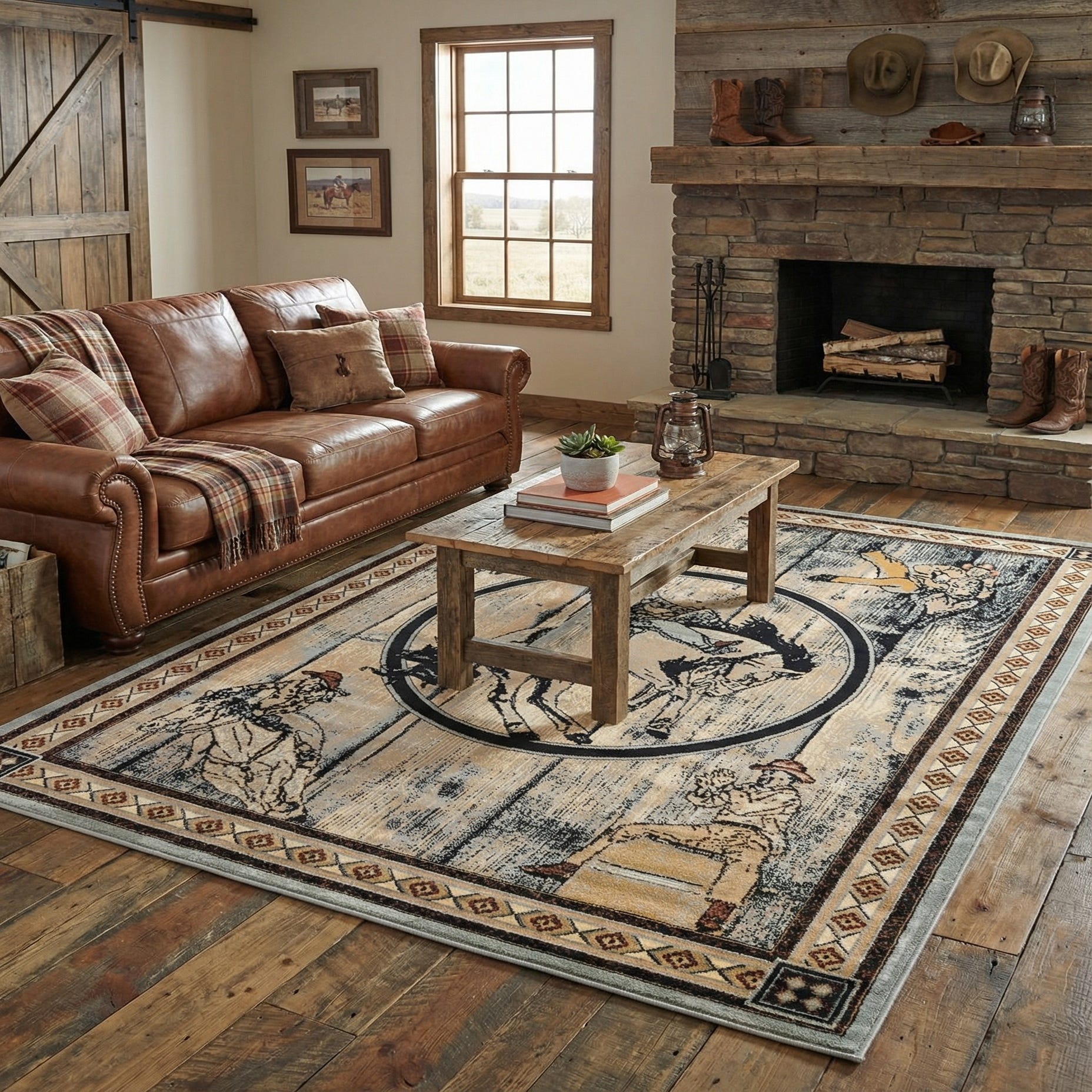 This rug pairs naturally with rustic or farmhouse interiors — think leather sofas, reclaimed wood tables, and iron accents — and also works well in a lodge, ranch-style home, or a casual family room or game space where themed, graphic pieces are welcome. Use it to ground a seating group, add character to an entry or mudroom, or layer over hardwood for a warm, lived-in look.