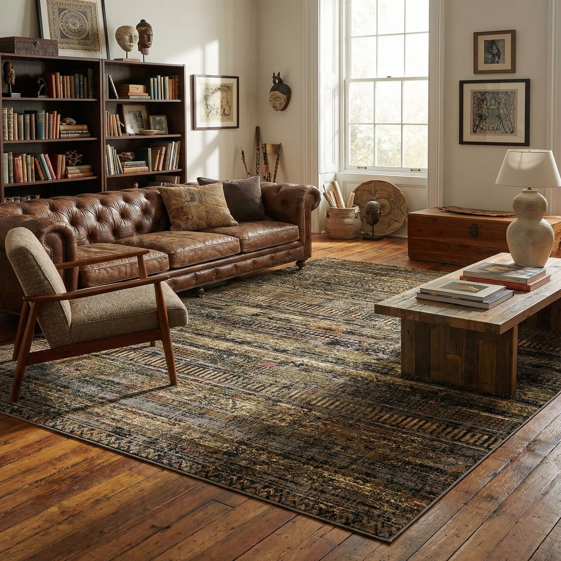 Place this piece to anchor a sofa and coffee table in a contemporary living room, or under a dining table where warm wood and metal finishes will pick up the rug’s olive and beige tones. It also works well in a home office or entryway, where the layered pattern adds visual interest without overwhelming other elements. Pair it with neutral upholstery and textured throws for a balanced look, or combine it with leather and iron accents for an industrial-meets-eclectic scheme.