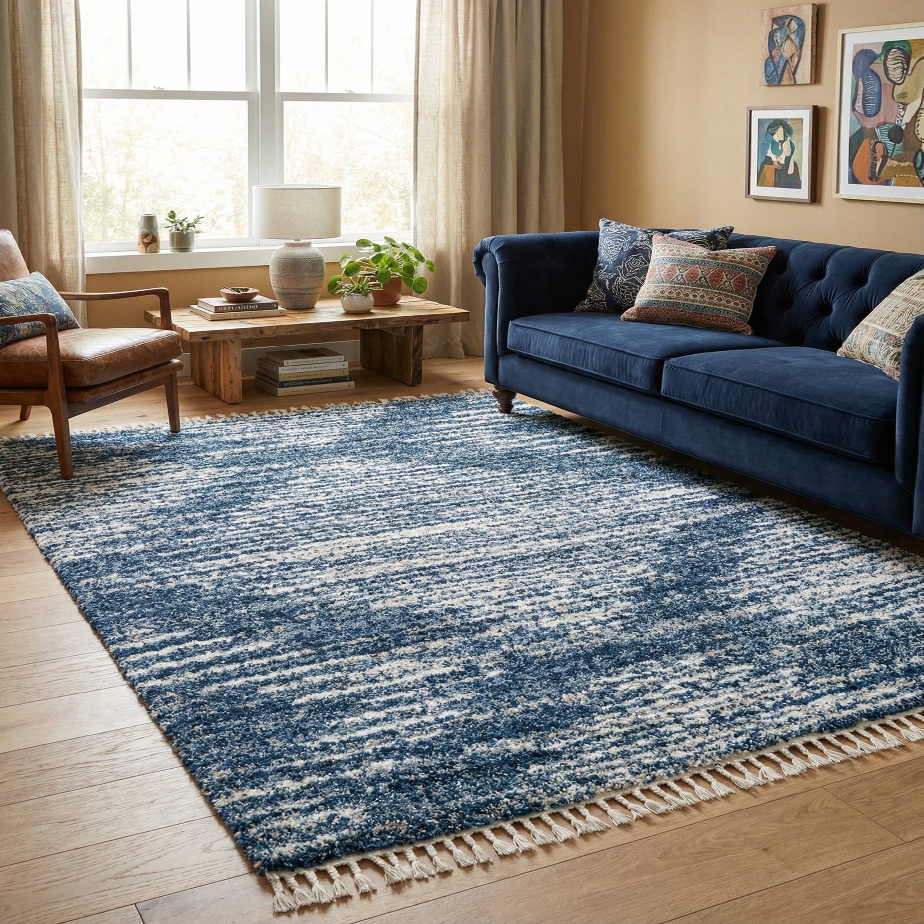 This shag rug would integrate well into a variety of interior designs, from contemporary to transitional spaces. It could serve as a striking focal point in a minimalist setting or complement a more eclectic mix of furnishings. In living rooms, bedrooms, or larger studios, this rug's serene color palette could harmonize with a range of color schemes, providing comfort and sophistication.