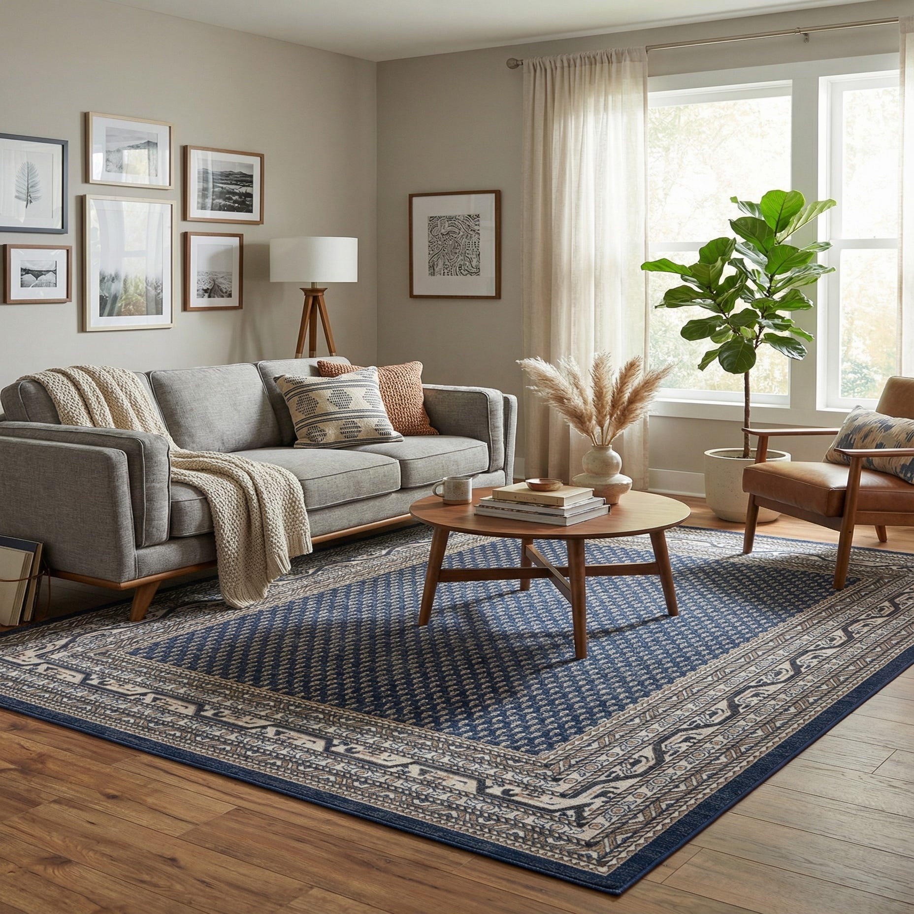 Machine made from 100% polypropylene, the rug has a low, tightly woven pile that feels smooth underfoot while the patterned weave provides a subtle texture you can notice to the touch. Its low profile makes it ideal under dining tables, beneath a sofa grouping, or in a home office where furniture legs sit evenly. Pair it with warm wood tones and neutral upholstery for a balanced, layered feel, or combine it with gray linens and light brown leather accents for a refined, transitional interior.