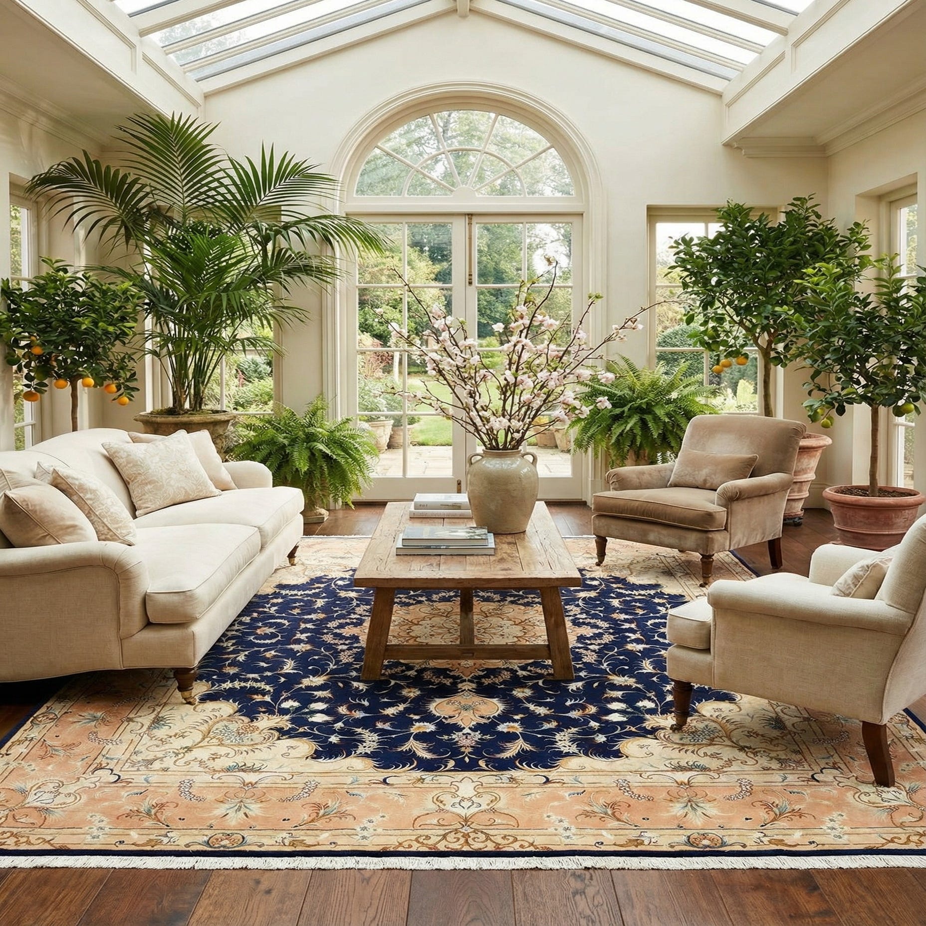 The rug's balance of warm and cool tones, along with its detailed patterning, makes it versatile for a variety of interior design applications. Its classic aesthetic would complement a formal living room or dining area, harmonizing with both vintage and contemporary furniture. In a more subdued setting, such as a study or home library, this rug could serve as a statement piece that adds depth and character to the room.