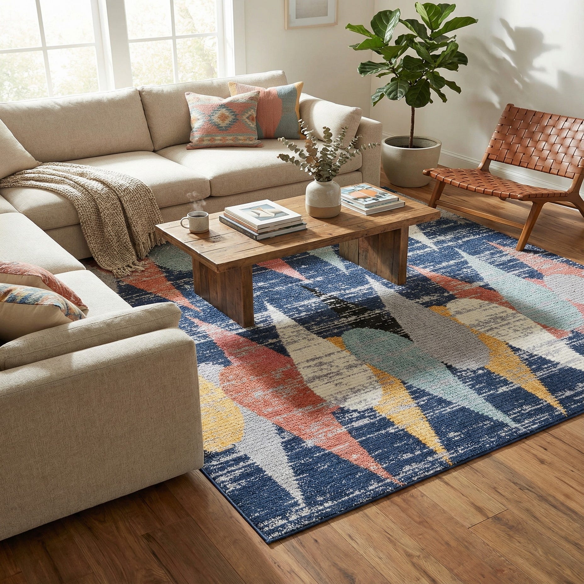 This rug complements mid-century modern or contemporary spaces—pair it with a streamlined sofa and warm wood finishes to highlight the graphic shapes and warm tones. It also suits coastal or transitional rooms where the deep blue and light-blue accents anchor the palette, or eclectic living areas that mix textures and patterns; use it to define a seating arrangement, add color beneath a dining table, or bring energy to a home office.