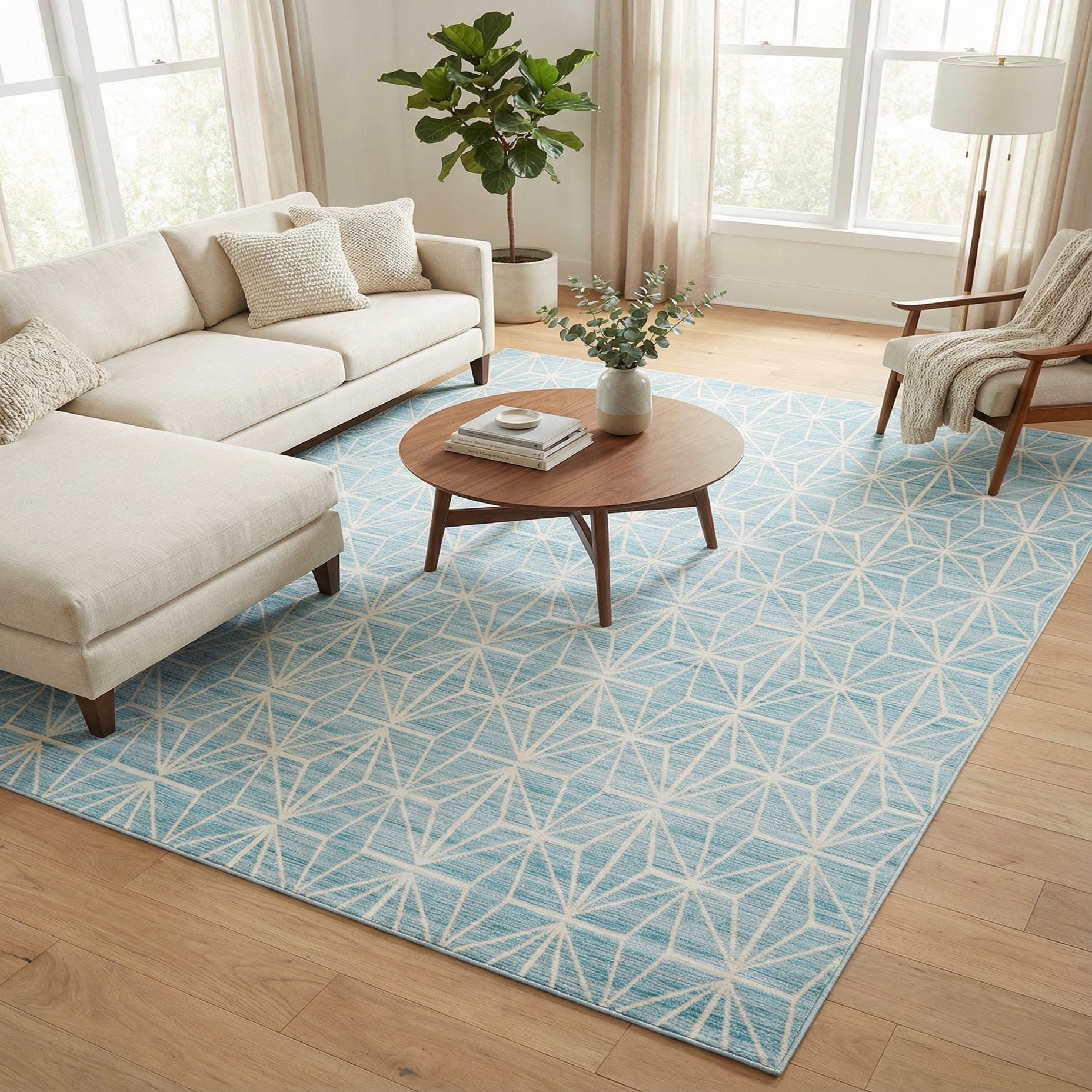 Machine-made from 70% polypropylene and 30% polyester, this rug has a low-profile weave with a soft, slightly cushioned hand. The blue field carries subtle striations of lighter and deeper blue that add depth, while a repeating geometric lattice of beige linear motifs—diamond and star-like shapes—creates a clear, tactile contrast across the surface. The pattern is orderly and modern, giving the rug a structured look without feeling heavy.