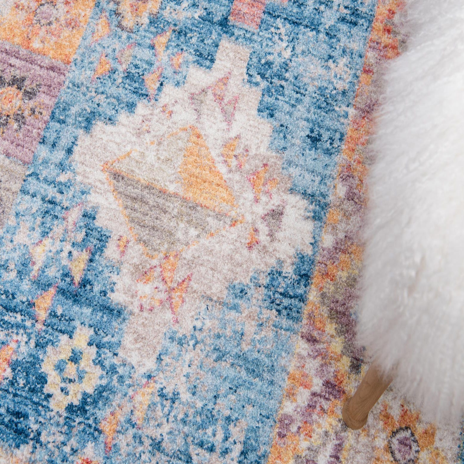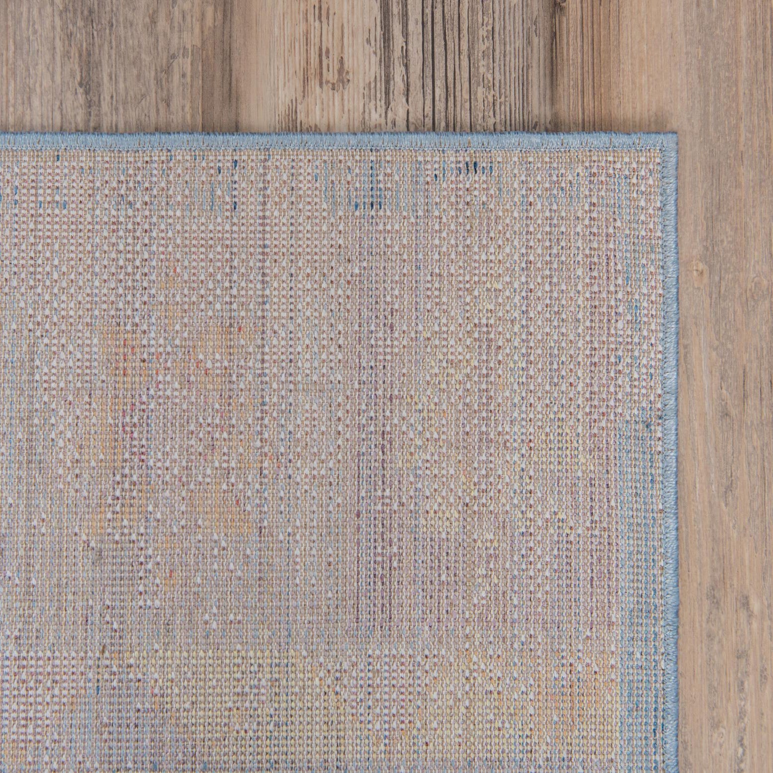 Primary color is Blue. Colors in this rug include: Blue, Beige, Gold, Gray, Red, Pink, Violet.