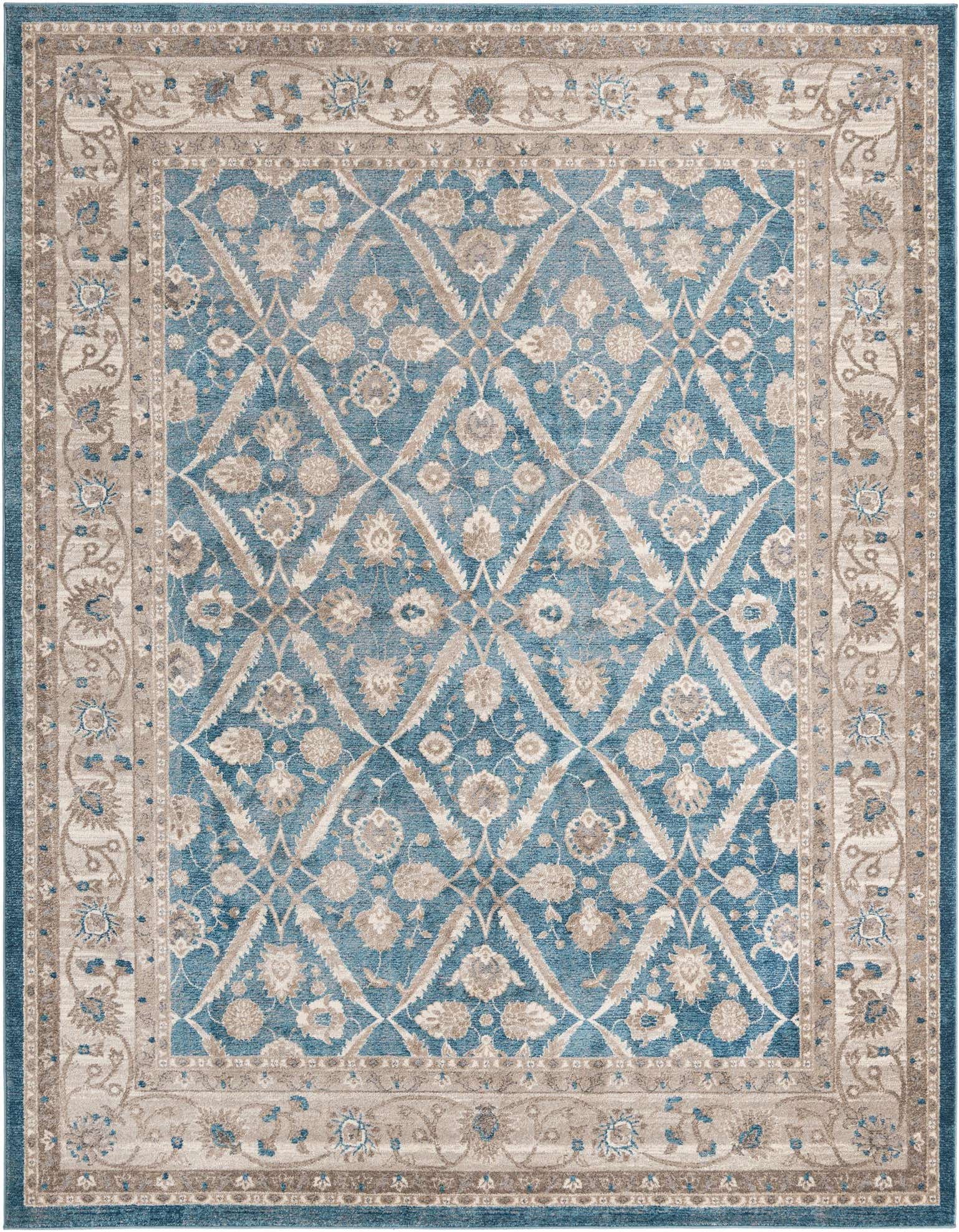 Primary color is Blue. Colors in this rug include: Blue, Beige, Ivory, Gray.