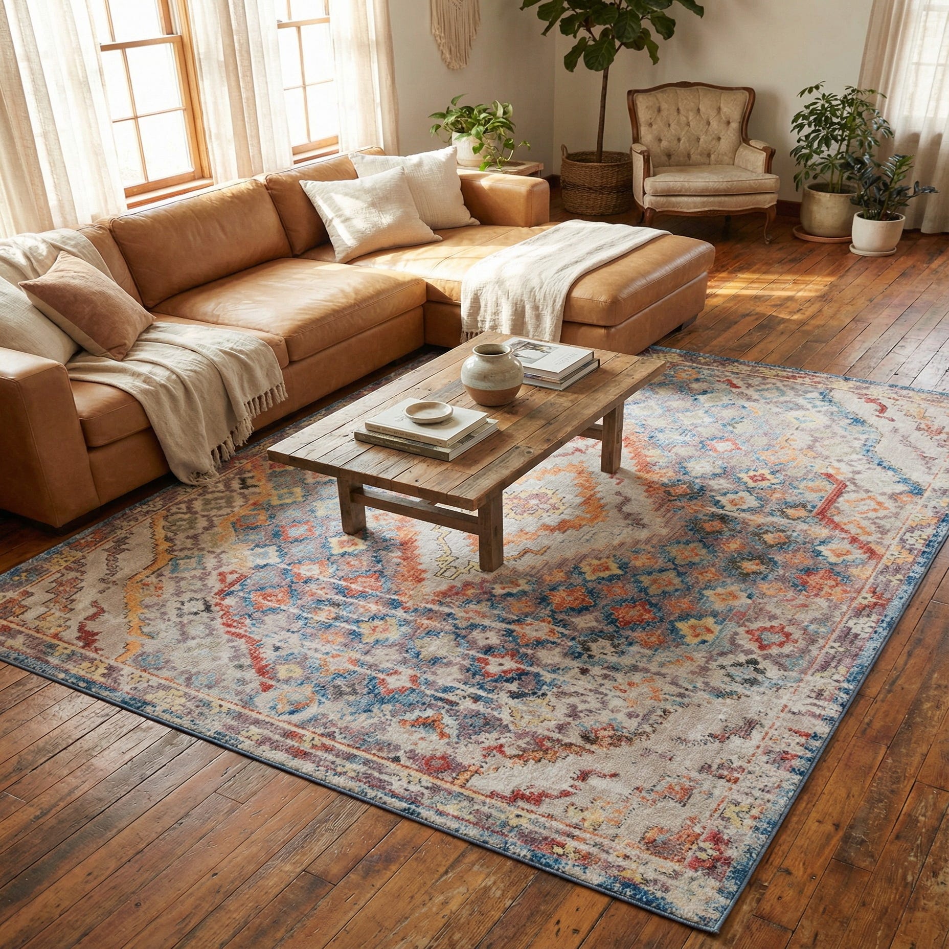 Machine made of 100% polyester with space-dyed yarn, the surface feels soft and smooth underfoot with a subtle, low-pile cushion and a slight sheen from the yarn that enhances the blended colors. It works well layered beneath a coffee table in a coastal or transitional living room, anchored under a bed to introduce color to a neutral bedroom, or placed in a casual dining or seating area paired with warm wood tones and brass accents. The rug pairs easily with navy upholstery, light linens, or eclectic patterns when you want a lived-in, colorful foundation that still reads refined.