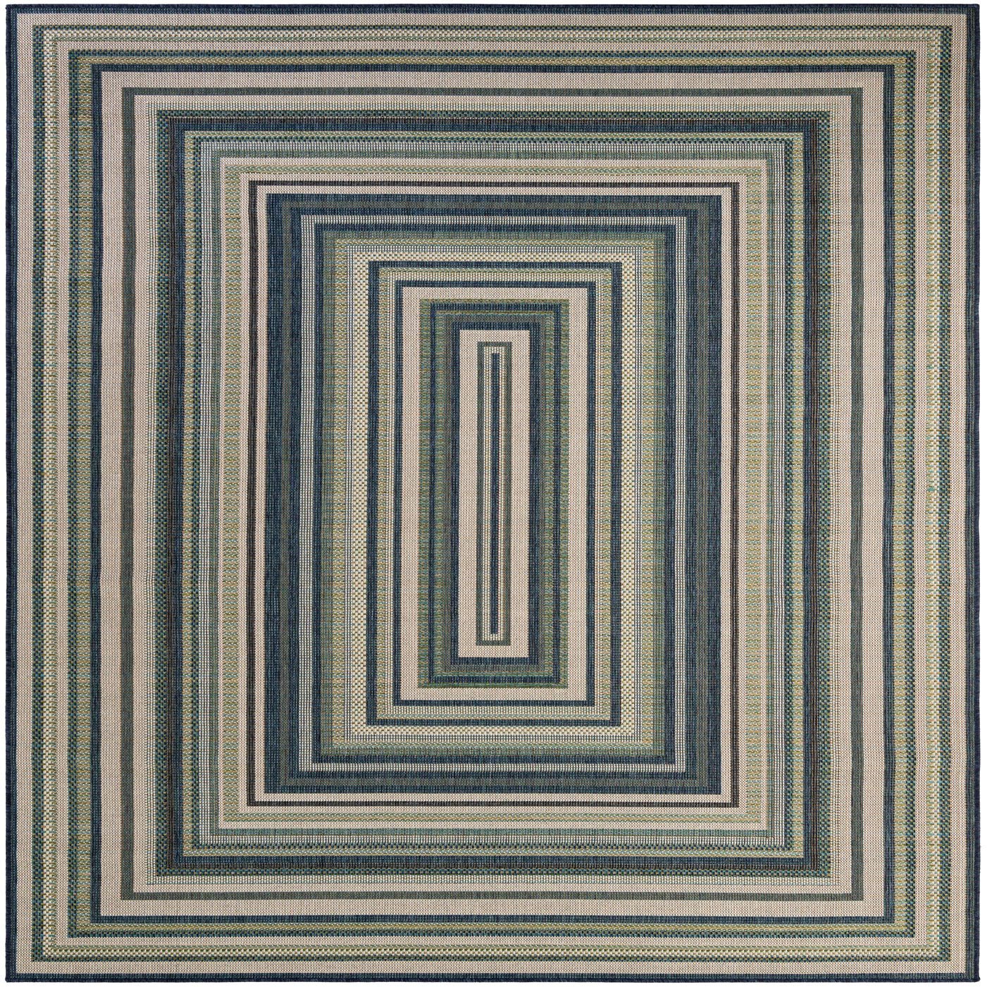 A crisp, geometric stripe pattern forms concentric rectangular frames across a blue background, creating a clean, architectural look. Bands of navy blue, olive, green and ivory alternate in narrow, woven lines that layer depth without adding pile. Running a hand across the surface reveals a low-profile, slightly textured weave — firm underfoot but with a subtle give — because it’s machine-made from 100% polypropylene and woven for outdoor living.