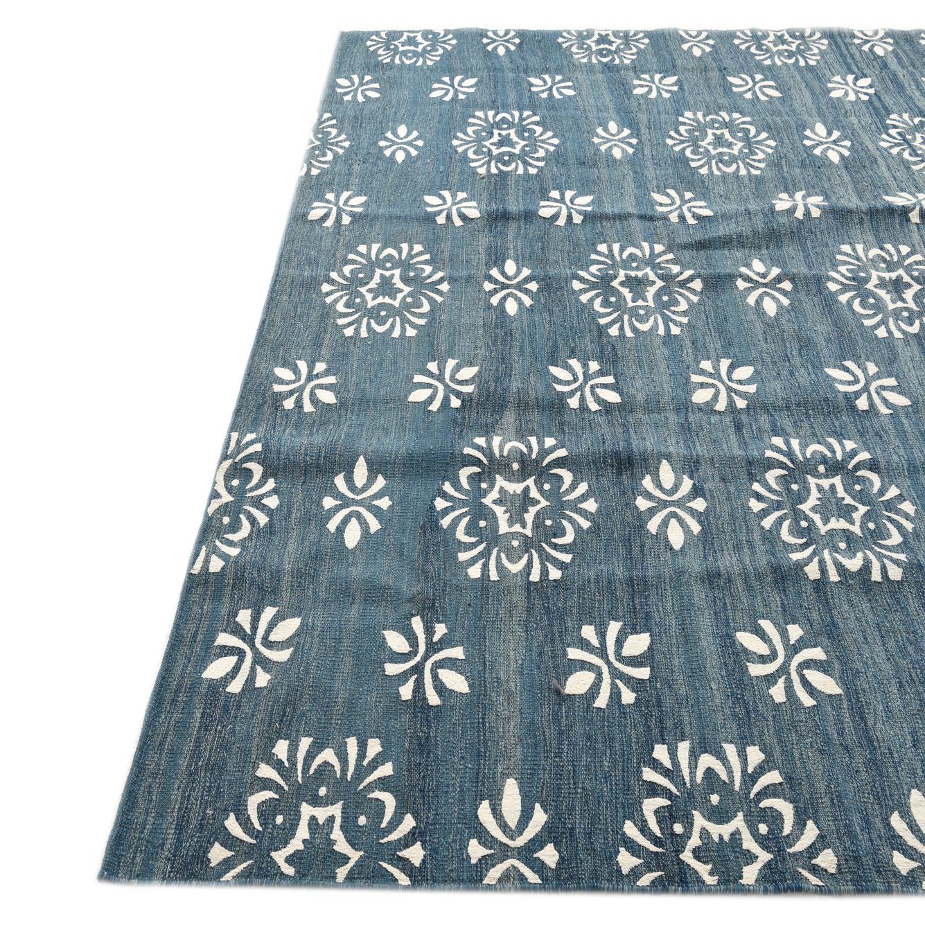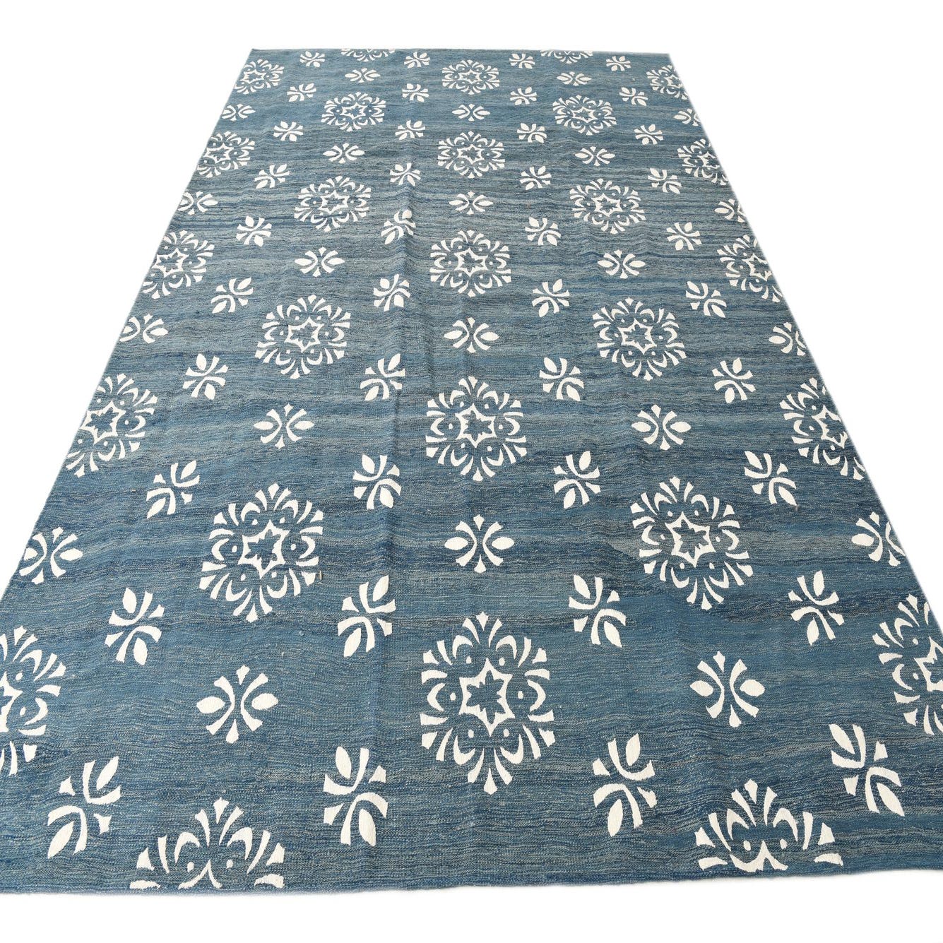 A rectangular 8x11 blue flatweave rug with a scattered white tribal medallion and abstract floral pattern, suitable for a living room.