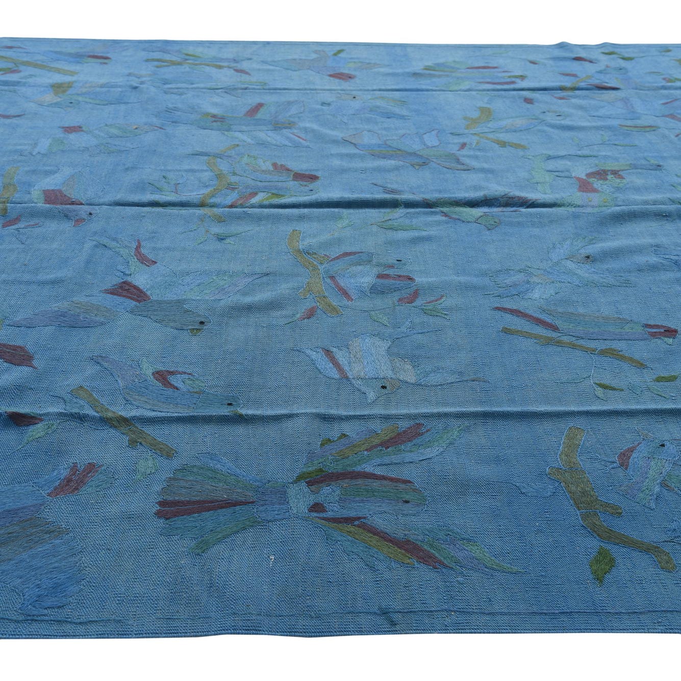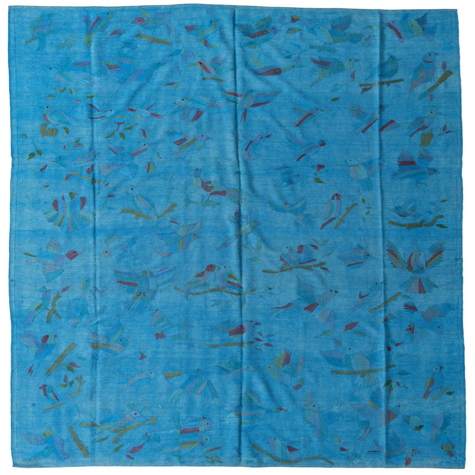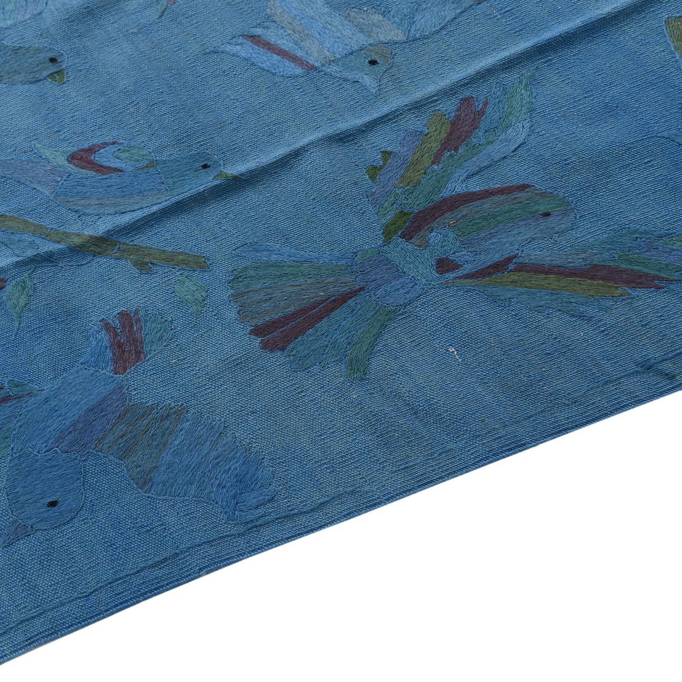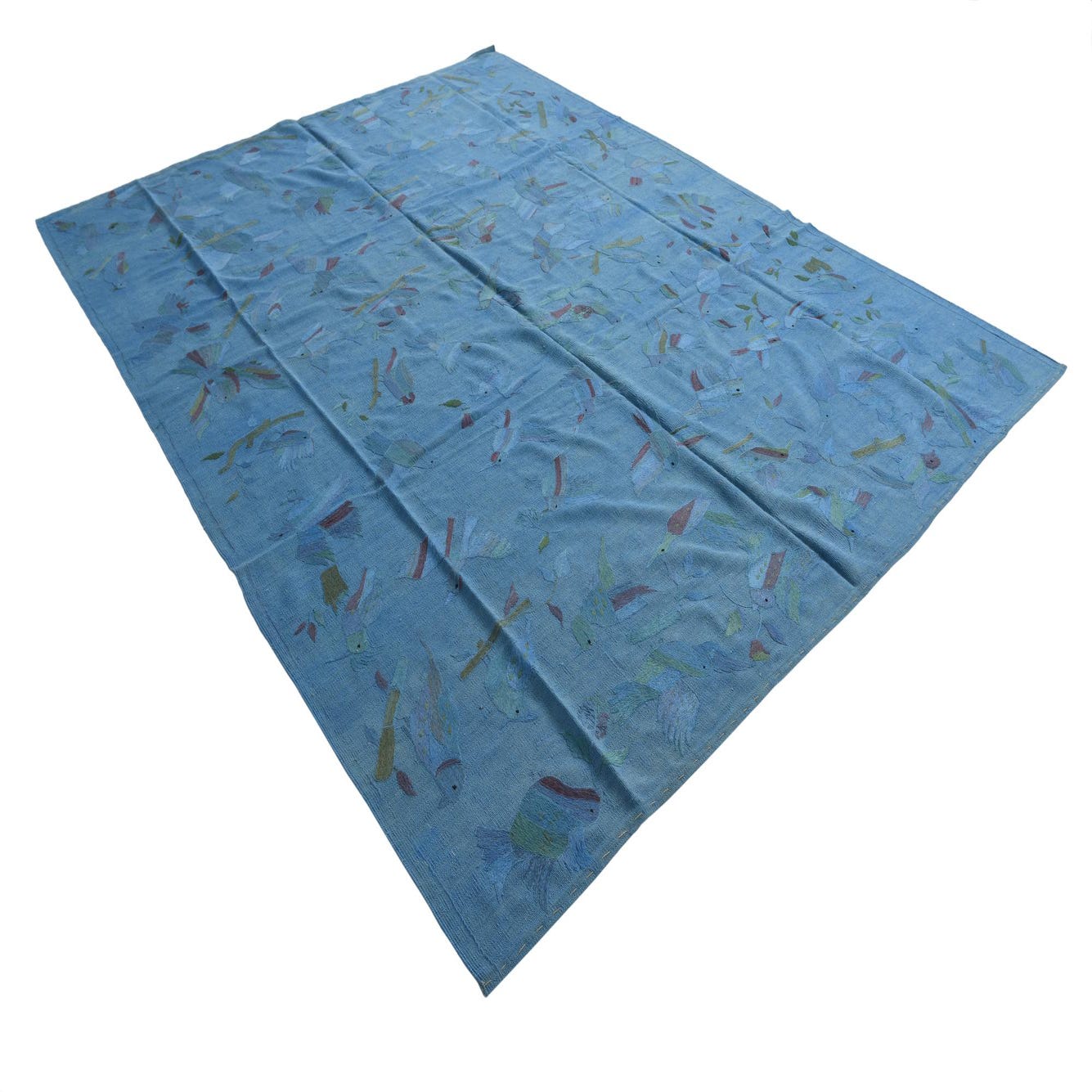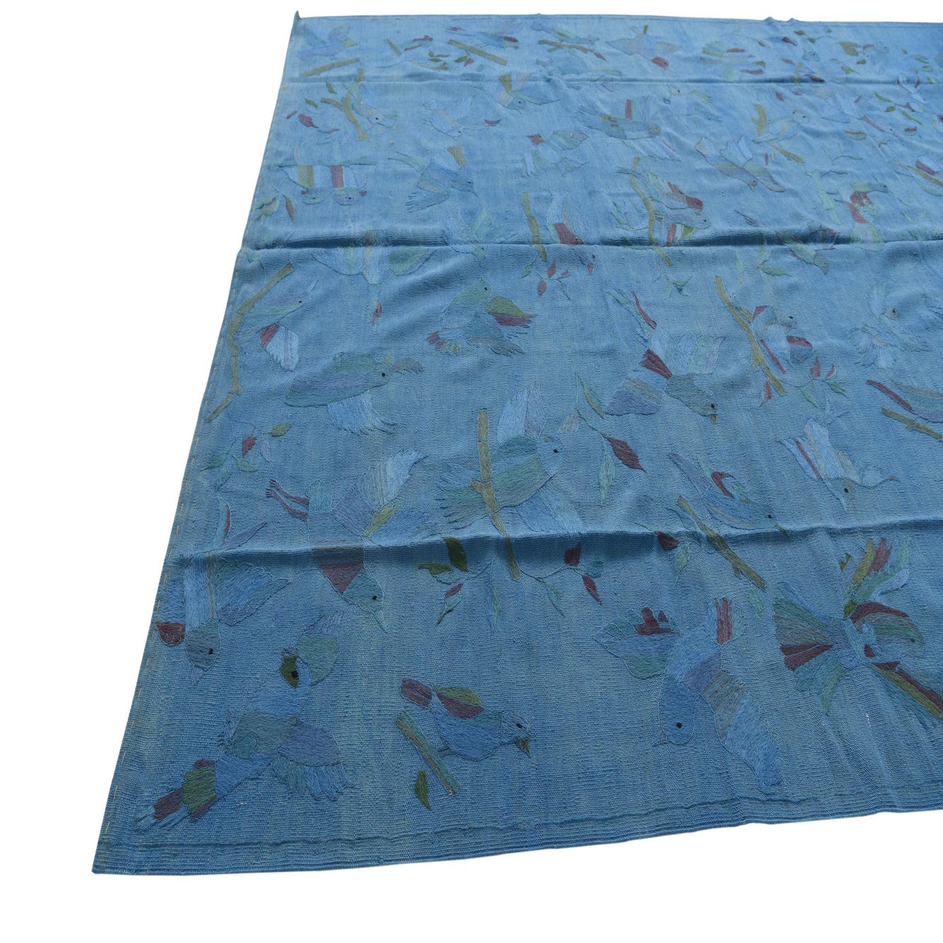 A rectangular 8x11 blue flatweave rug with a scattered pattern of colorful birds and branches.