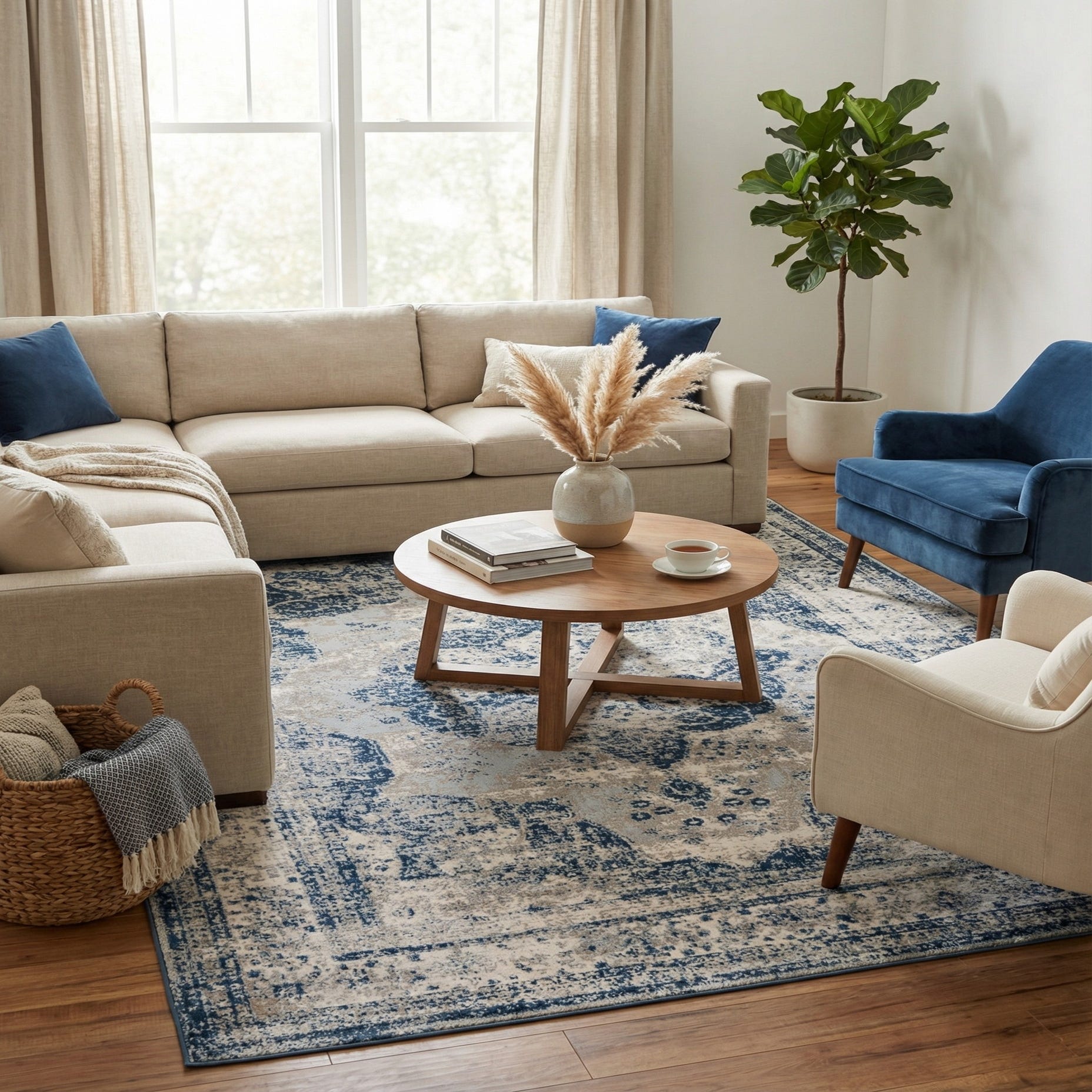 The versatile color palette and transitional pattern make this rug suitable for a range of interior design scenarios. It could be a grounding element in a coastal-inspired space, harmonizing with light woods and seaside hues. Alternatively, this rug could complement a modern farmhouse setting, where its rustic pattern contrasts with clean lines and natural textures. Its large dimensions make it ideal for defining seating areas in open floor plans or anchoring furniture in spacious living rooms.