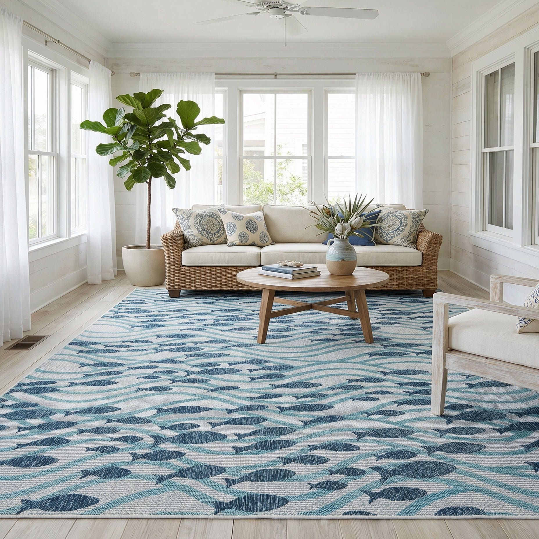 This design works well in coastal, nautical, or casual contemporary interiors. It can anchor a living room seating area with whitewashed wood and linen upholstery, sit beneath a dining table for a relaxed waterfront look, or brighten a covered porch or sunroom paired with natural wicker and jute accents. The palette of blue, light blue, navy blue and ivory complements neutral furnishings and layered natural textures for an easygoing, pulled-together space.