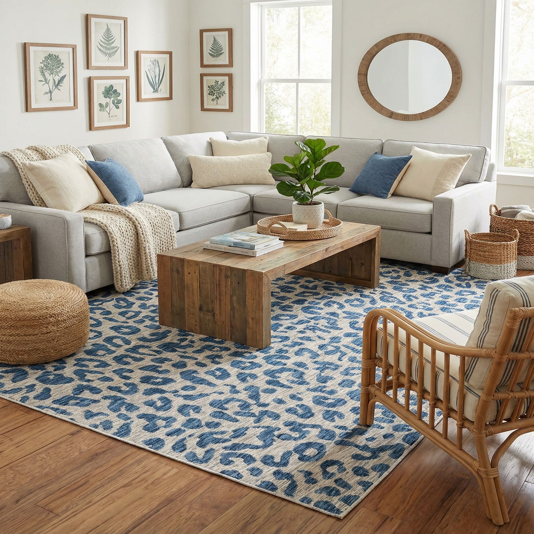 A rectangular 8x11 blue and white leopard print rug from the Outdoor Safari collection, suitable for indoor/outdoor use.