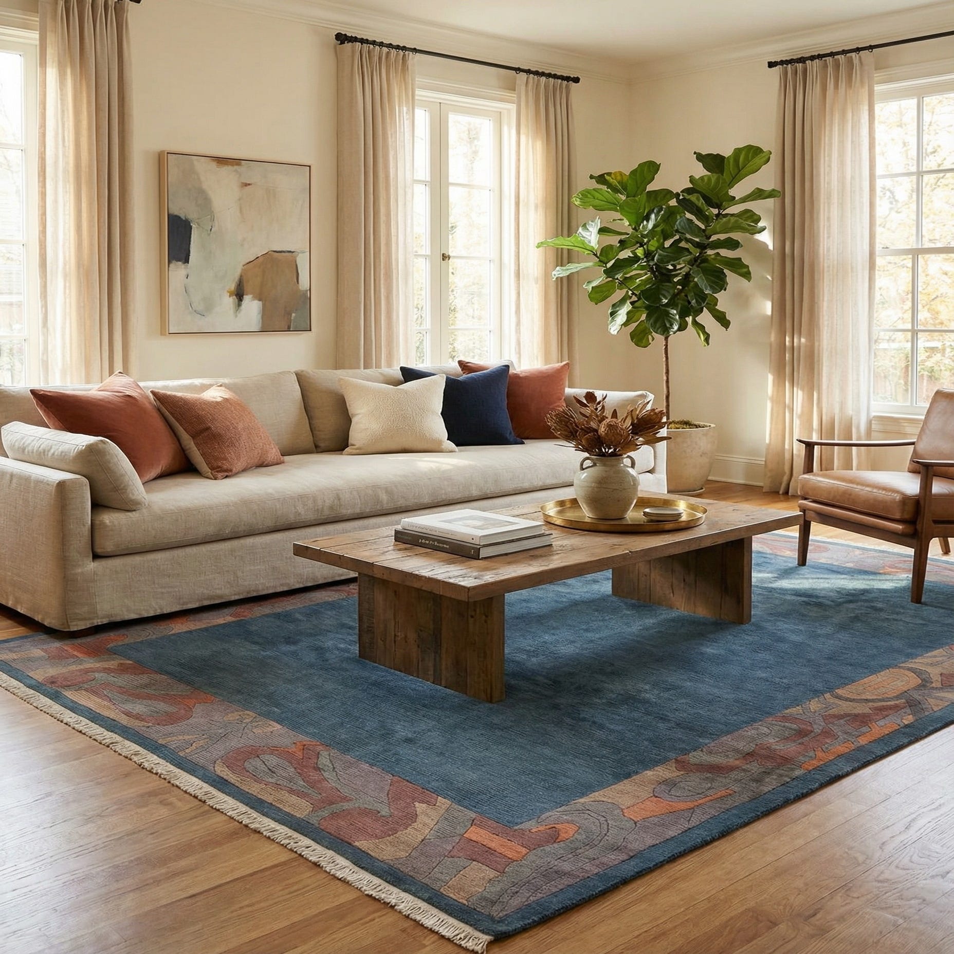 This rug works well as a grounding element beneath a seating group in a living room or as an anchoring layer beneath a dining table, where the bold field and patterned border add structure without overwhelming other finishes. Pair it with warm wood furniture and leather accents to echo the border’s earth tones, or let it sit against neutral upholstery and brass details for a calm, collected look with a hint of color. It also complements eclectic or transitional interiors that mix modern lines with handcrafted textures.