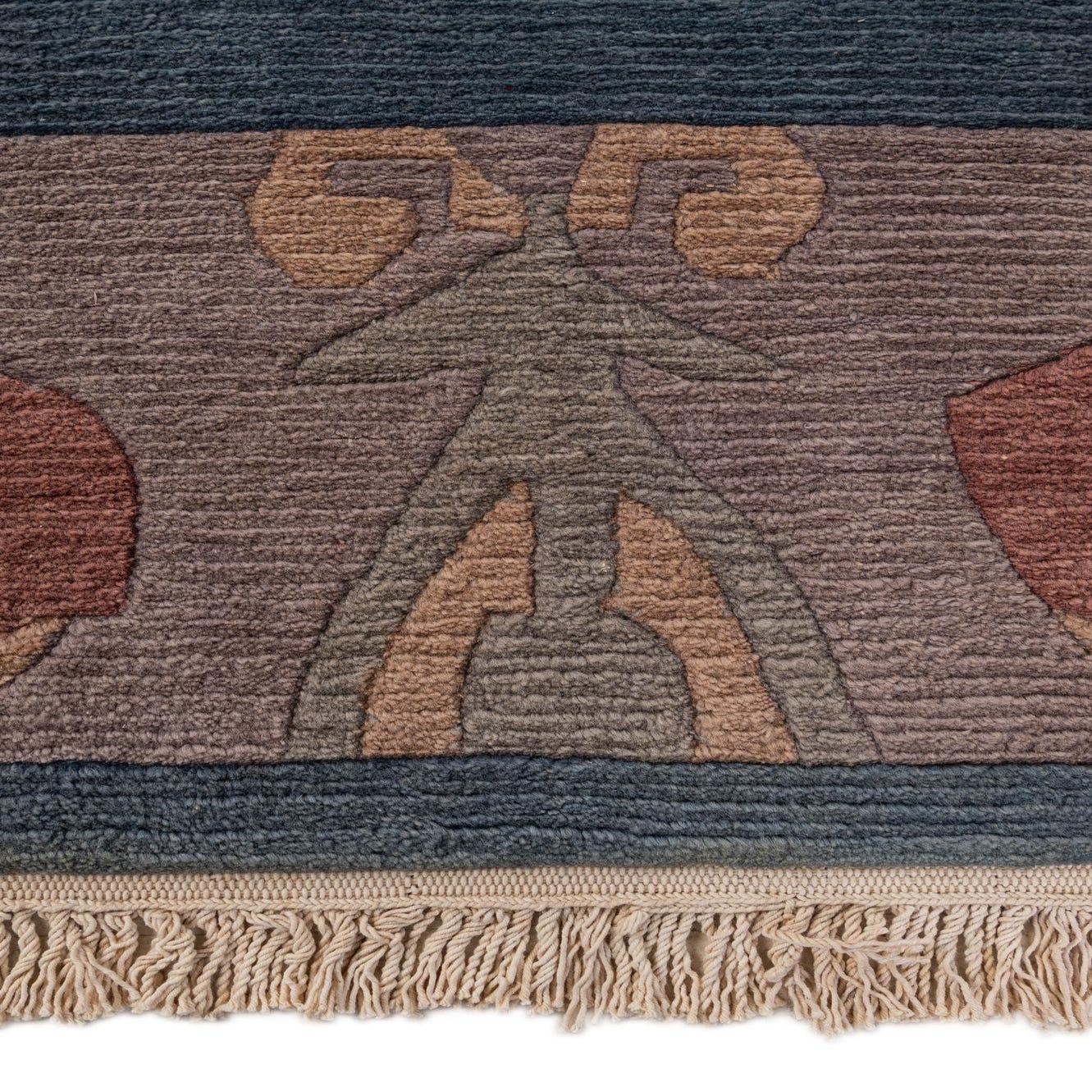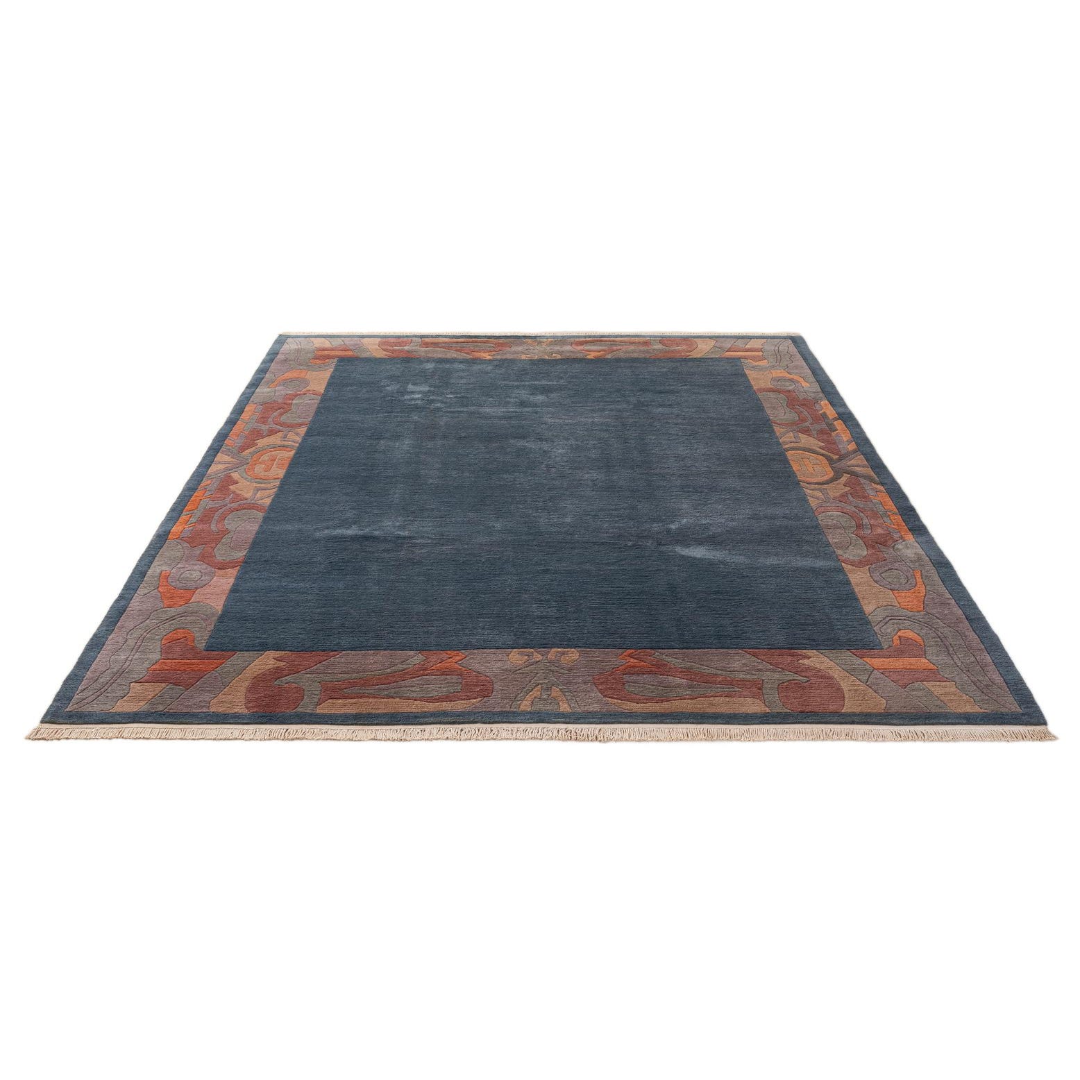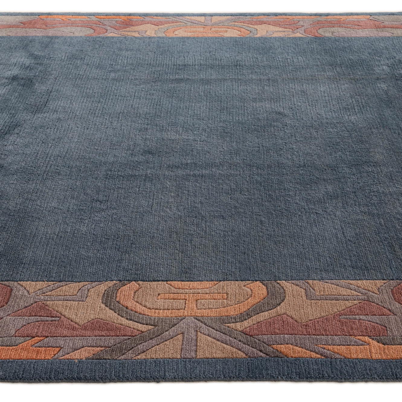 A deep blue field anchors this hand-knotted, 100% wool rug, its smooth, dense pile offering a soft but substantial feel underfoot. A broad, patterned border frames the center with an arrangement of organic, abstract motifs in gray, green, ivory, orange, red and beige, the muted earth tones providing a measured contrast to the saturated blue. Subtle variation in the wool pile catches light gently, giving the surface a low sheen and a tactile, lived-in quality; short fringes at the ends finish the piece with a traditional touch.