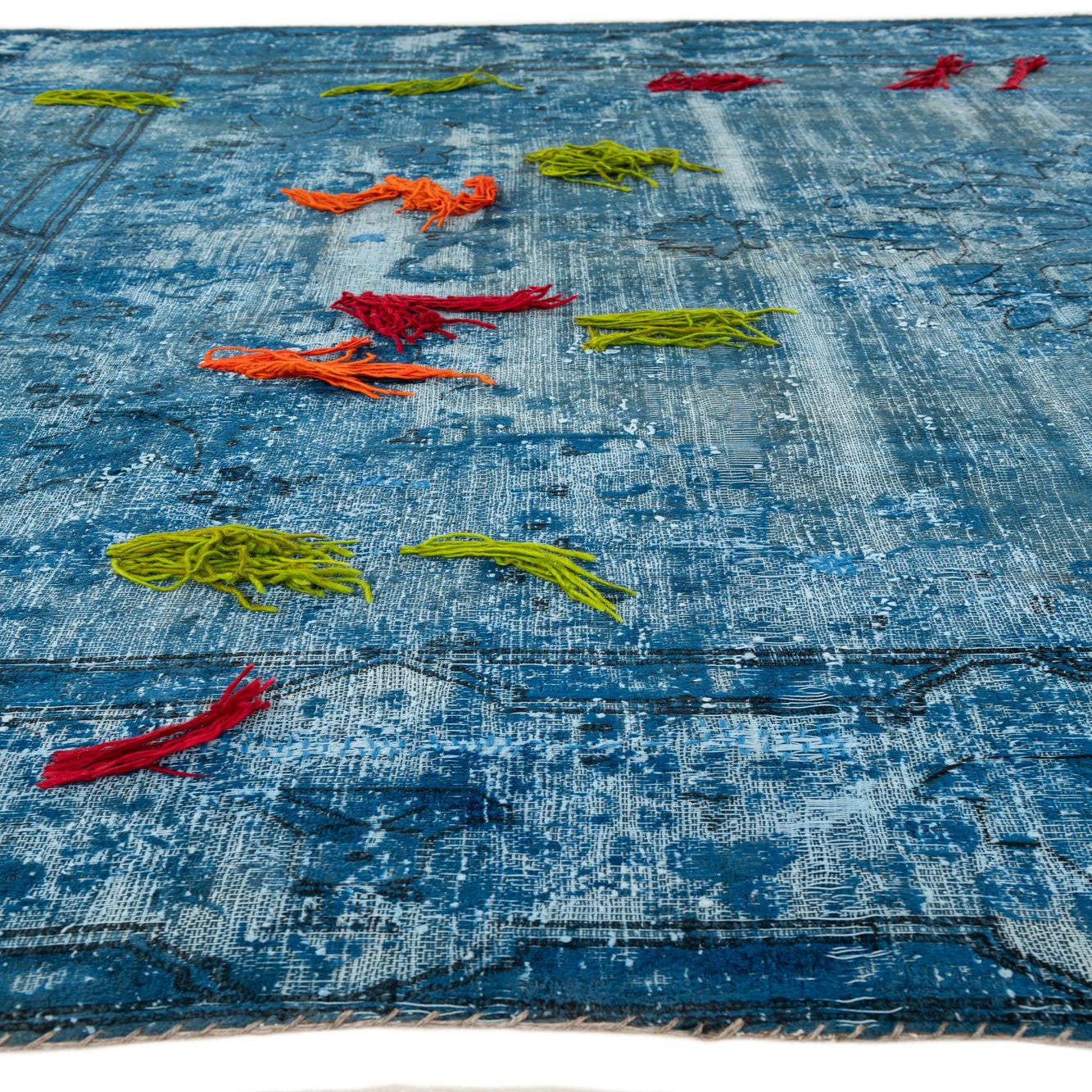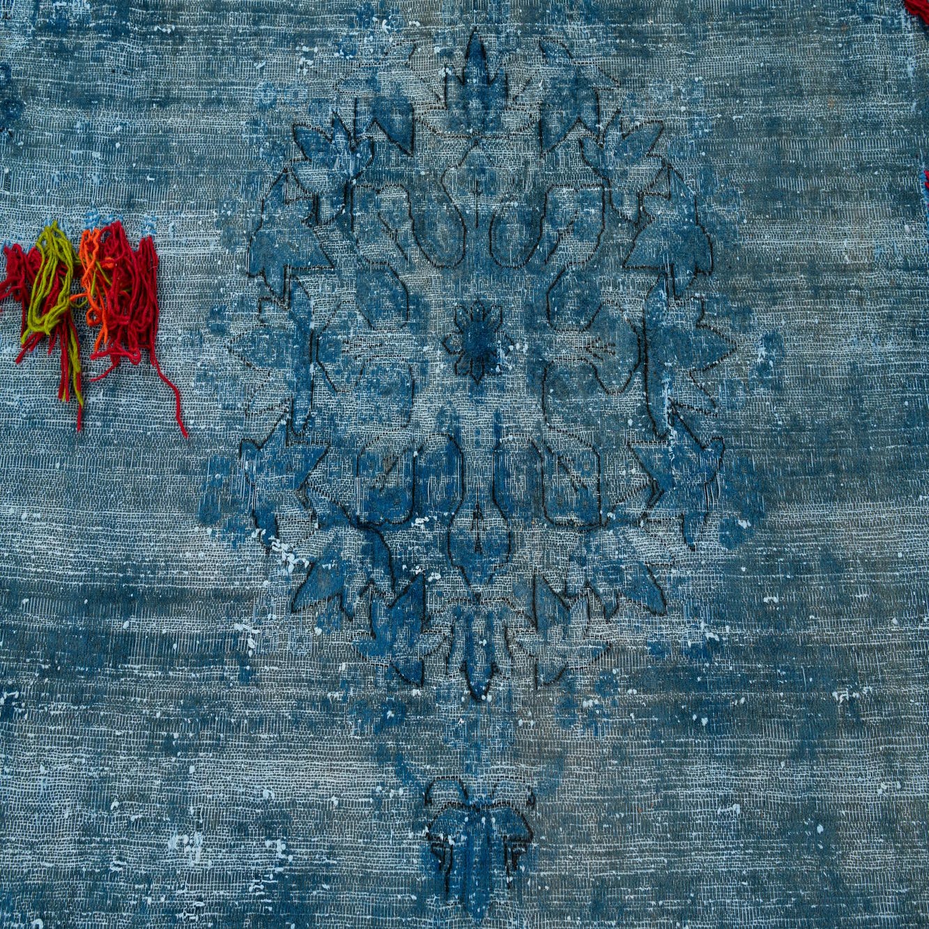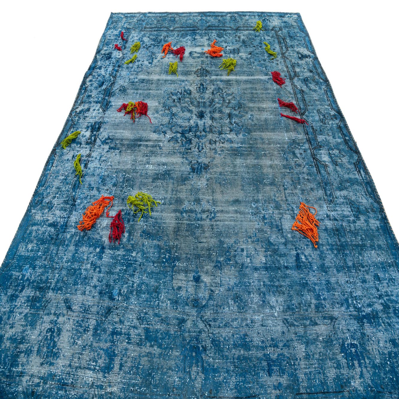 An 8x11 rectangular blue vintage Persian rug with a faded medallion pattern and colorful red, orange, and lime green yarn accents.