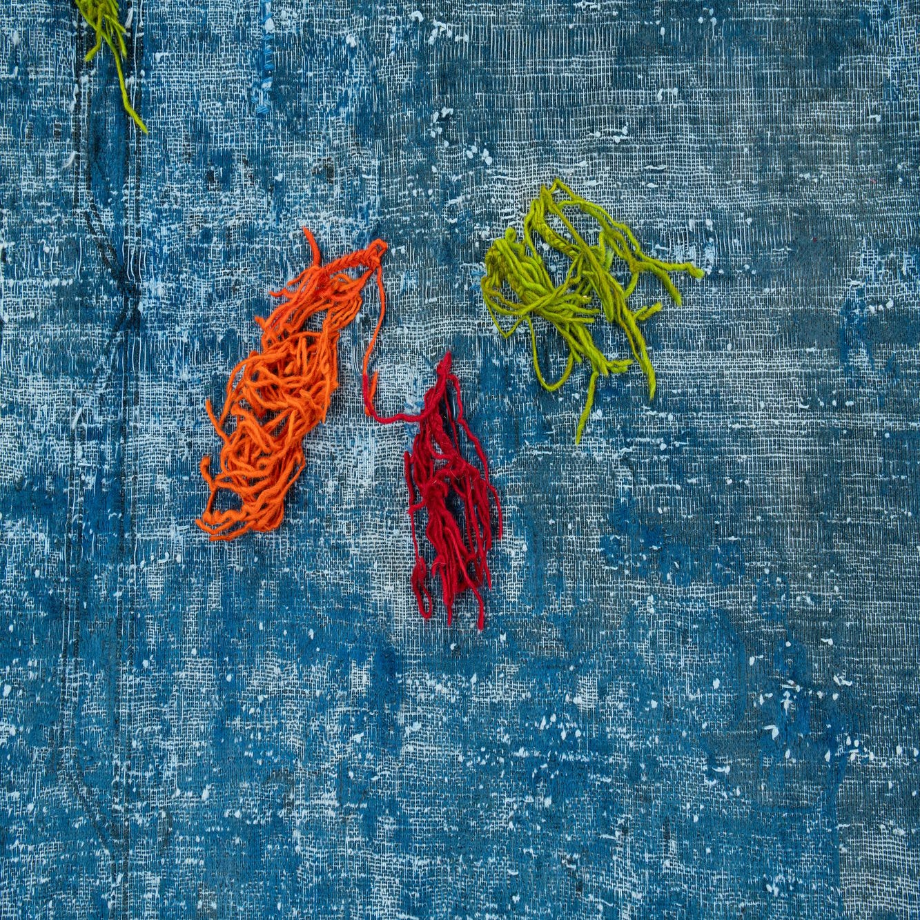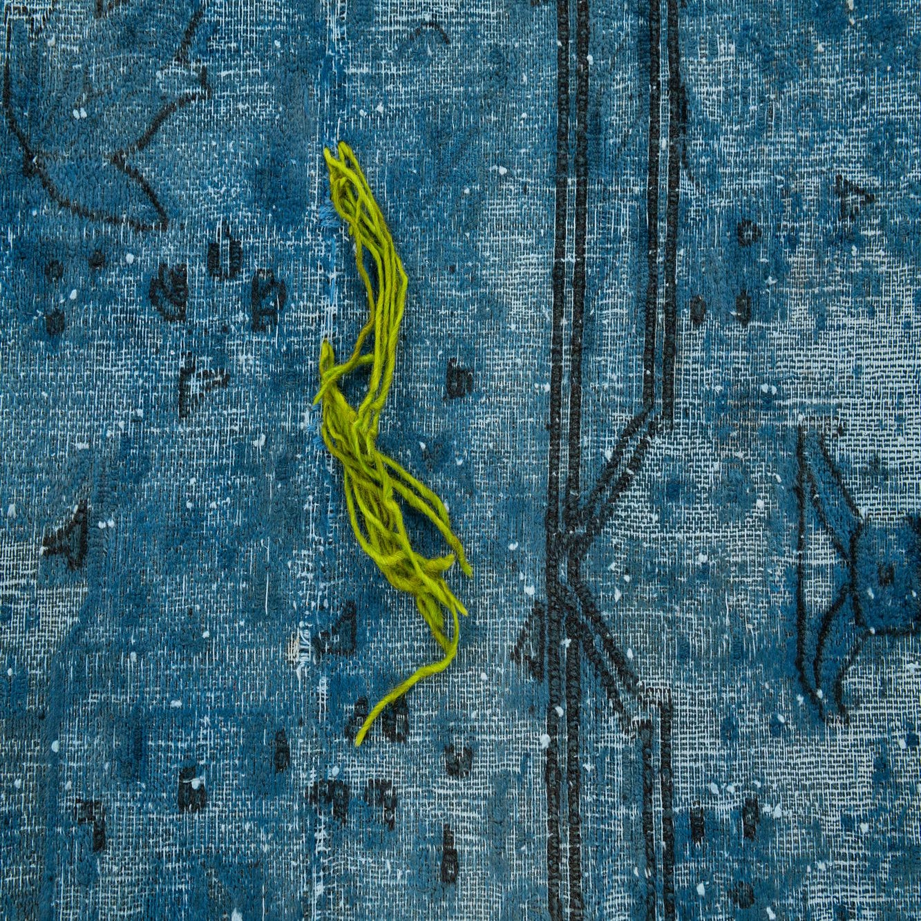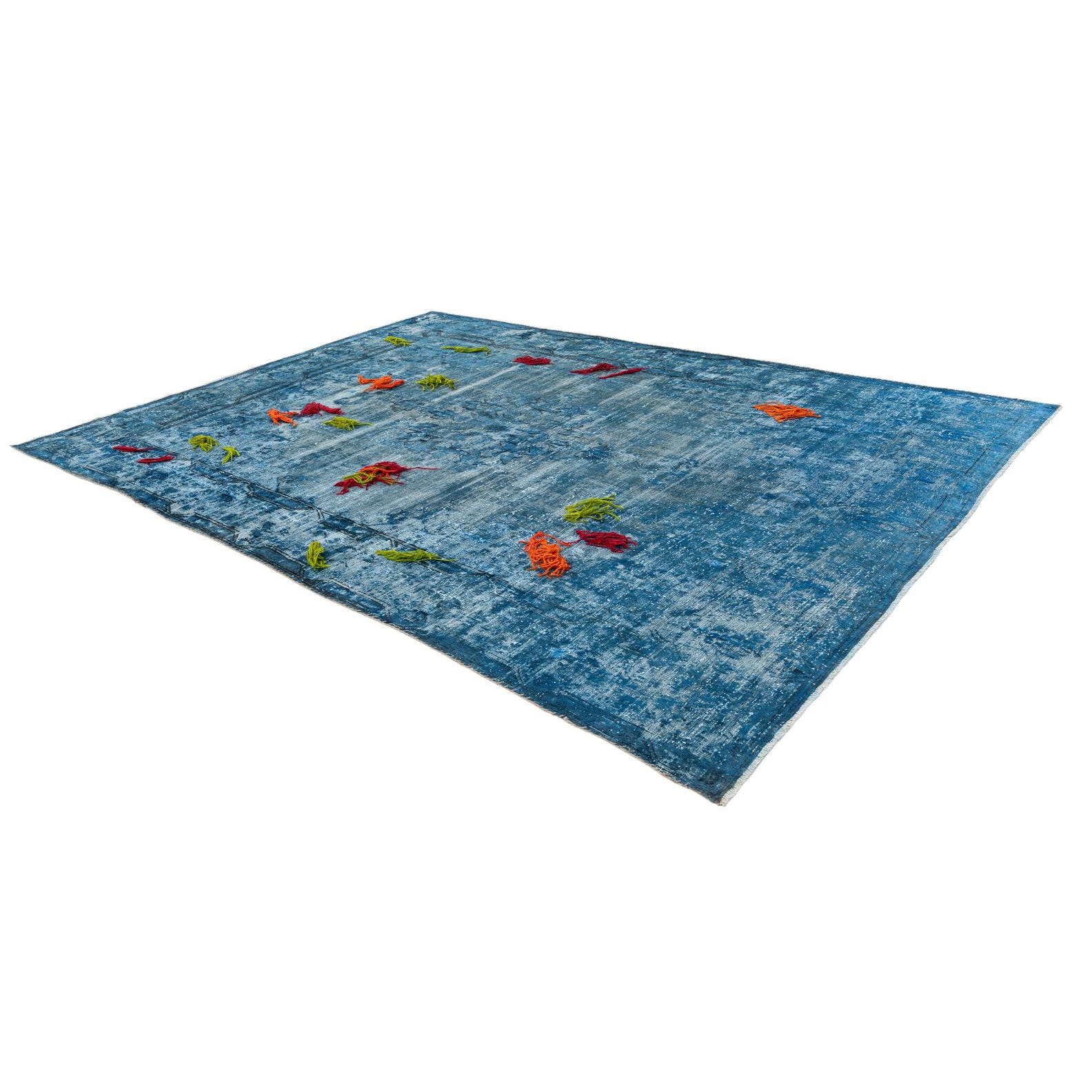 An 8x11 rectangular blue vintage Persian rug with a faded medallion pattern and colorful red, orange, and lime green yarn accents.