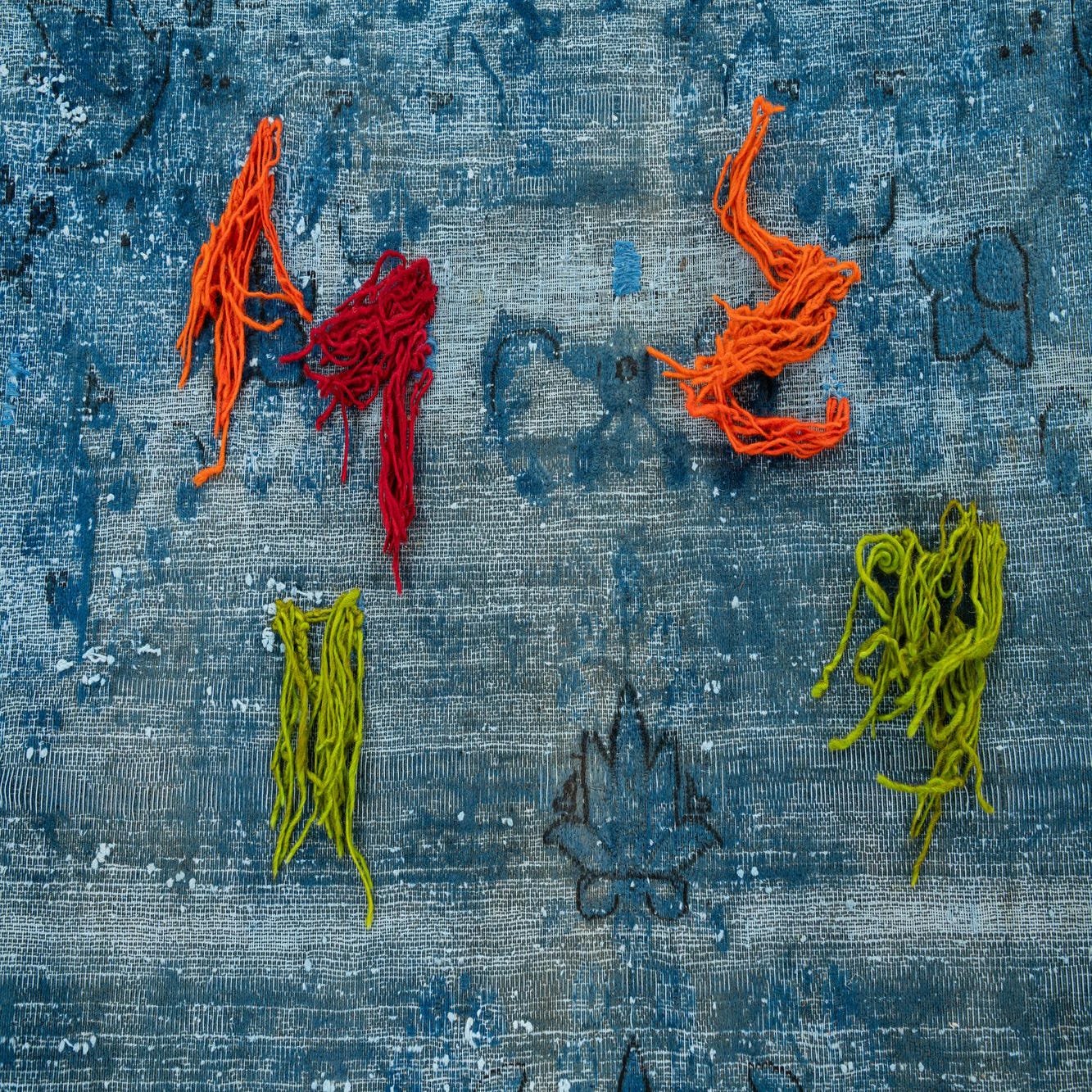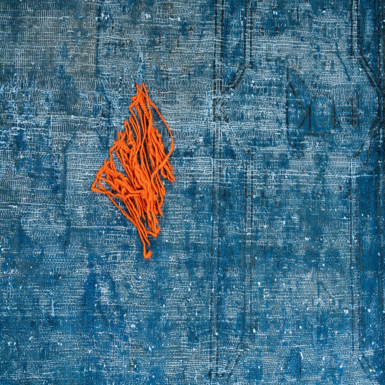 Primary color is Blue. Colors in this rug include: Blue, Ivory, Navy Blue, Orange, Red, Green.