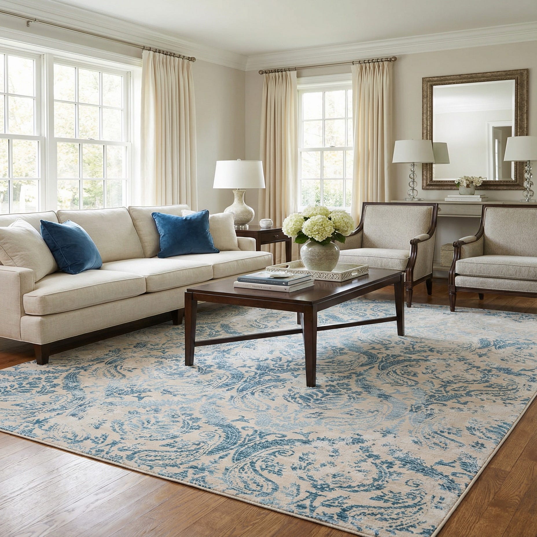 Place this rug beneath a living room seating group to anchor neutral sofas and natural wood furniture, or layer it under a dining table to introduce pattern without overwhelming the space. It also works well in a bedroom with light linens and coastal or contemporary accents, and will complement painted cabinets, soft textiles, and brushed metal details for a balanced, comfortable interior.
