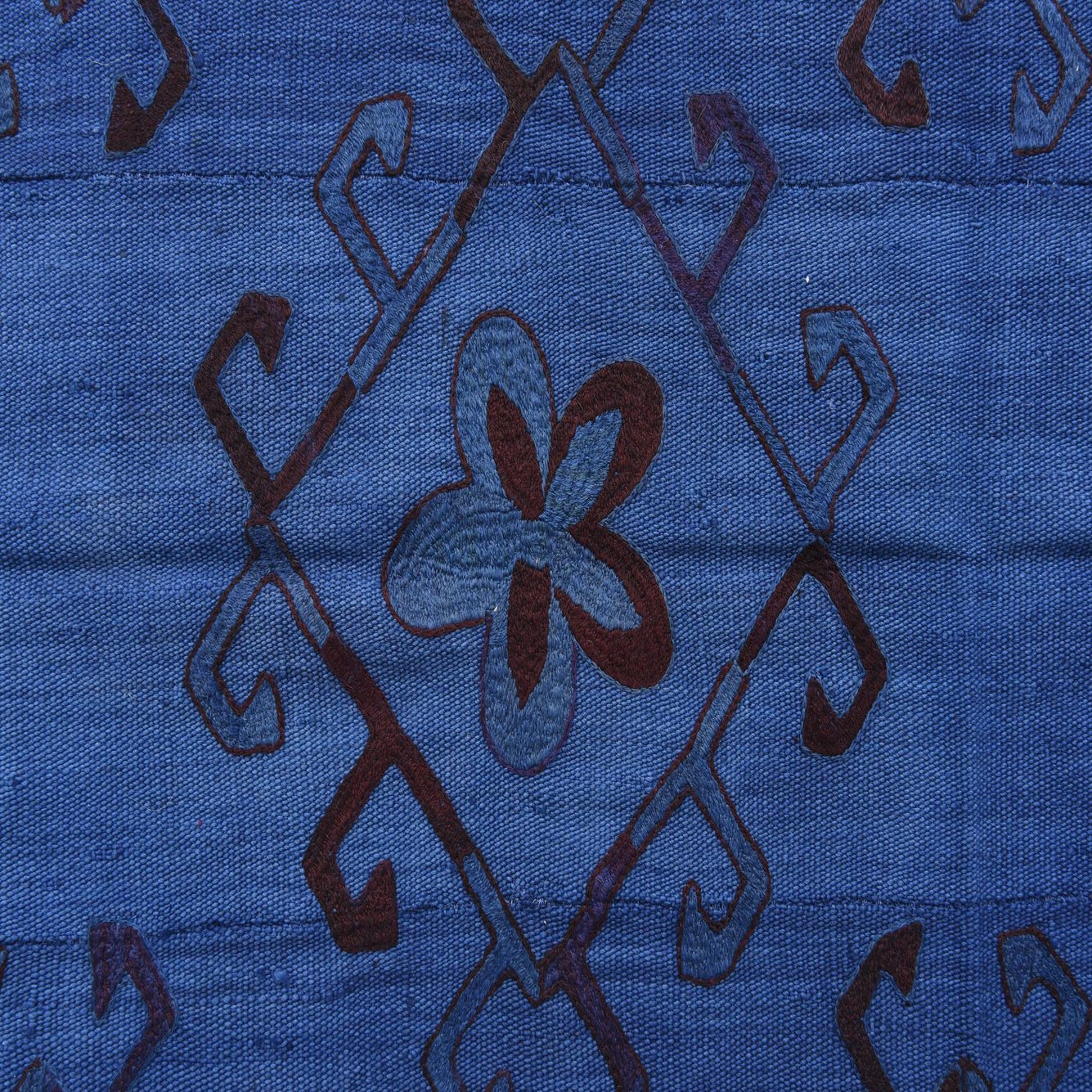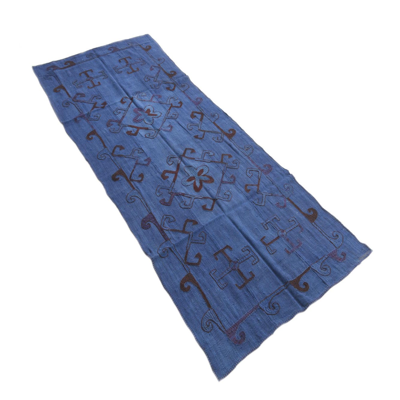 Our Kilim Suzani collection presents a 9 ft runner hand woven from 100% wool, showcasing rich textural depth and longevity. The main hue of this runner is a deep, vibrant blue, which provides a vivid backdrop for the bold geometric motifs that are arranged in a traditional, repetitive pattern. Accents in black enhance the sharpness of the design, offering a visual contrast and adding to the rug's distinctive character.