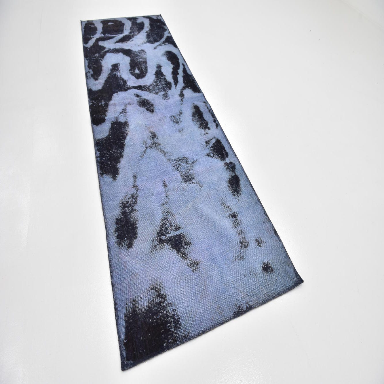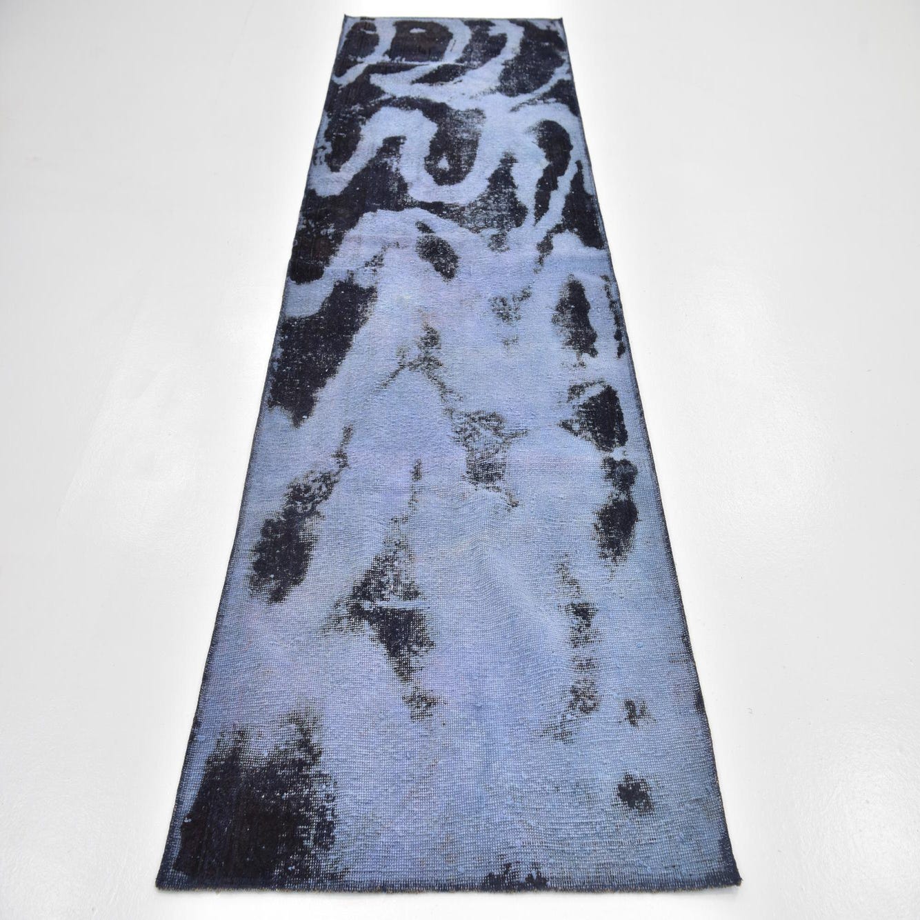 A 9 ft runner rug featuring an abstract, distressed pattern in varying shades of blue, ideal for a hallway.