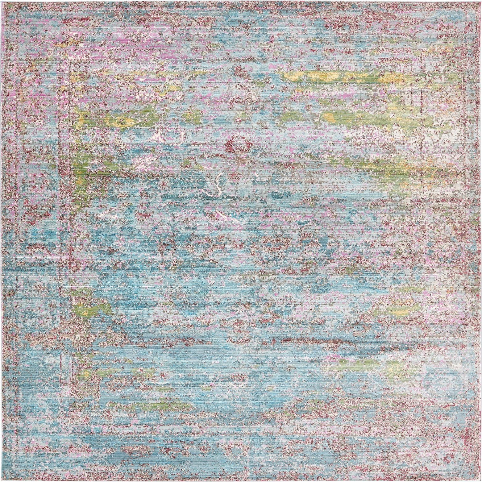 Primary color is Blue. Colors in this rug include: Blue, Burgundy, Gray, Green, Puce, Purple, Yellow, Pink, Beige.