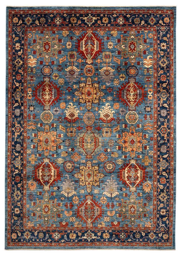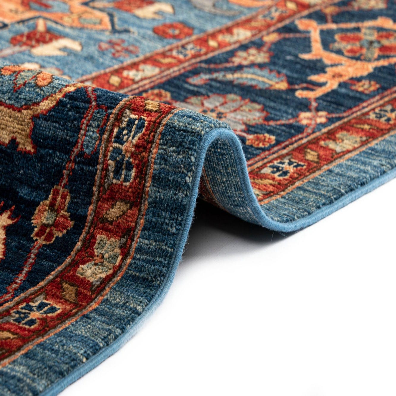 The color palette includes rich tones of blue, dark blue, red, orange, beige, green, and yellow, set against a predominantly blue background. This versatile color blend makes the rug suitable for a variety of interior design themes. The harmonious mix of warm and cool tones can complement a traditional setting, anchor an eclectic space, or serve as an accent in a minimalist area.