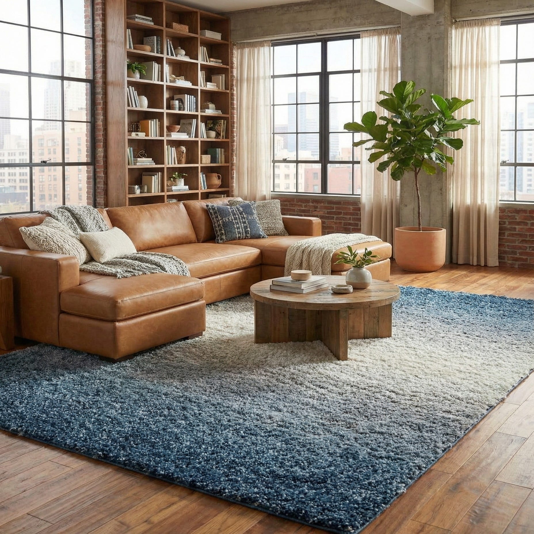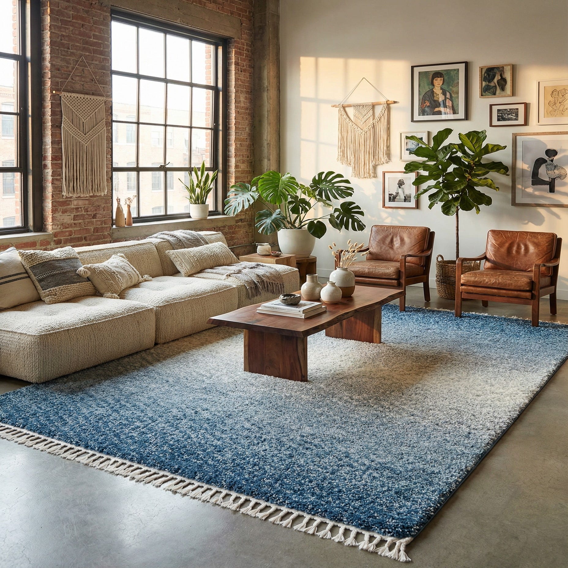 This rug works well as an anchor for a living room seating area or beneath a bed to add softness to hardwood or tile floors. Its coastal-to-contemporary palette fits nicely with light woods, linen upholstery, and navy or metallic accents, and it also layers effectively in transitional or Scandinavian-inspired interiors to introduce color without heavy pattern.