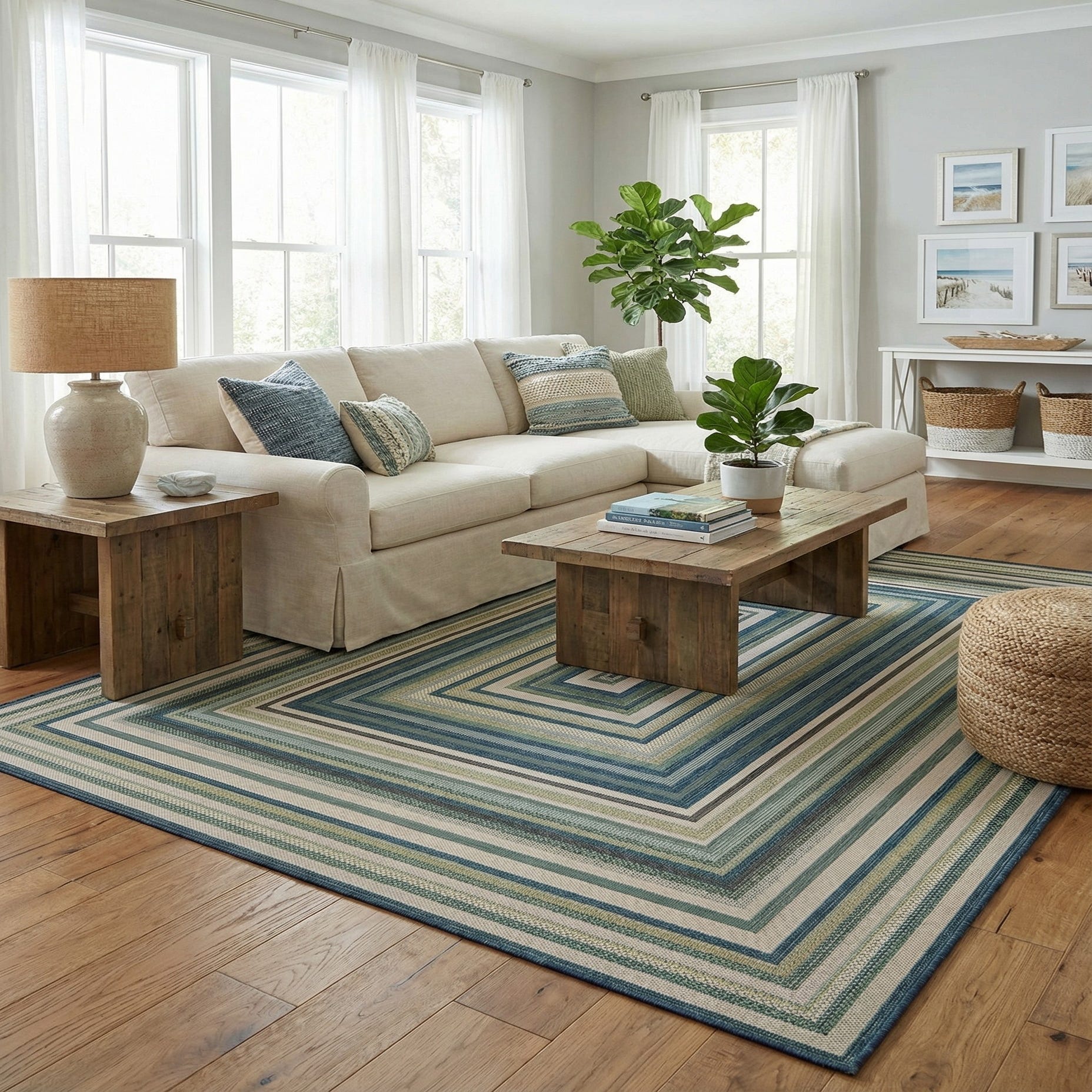 The color palette and structured pattern suit casual coastal or contemporary settings—think covered patios, sunrooms, or a living room anchored by natural wood and navy upholstery. Pair it with wicker seating and light linens for an outdoor-living vibe, or set it beneath a minimalist coffee table to add measured pattern and color to a modern interior.