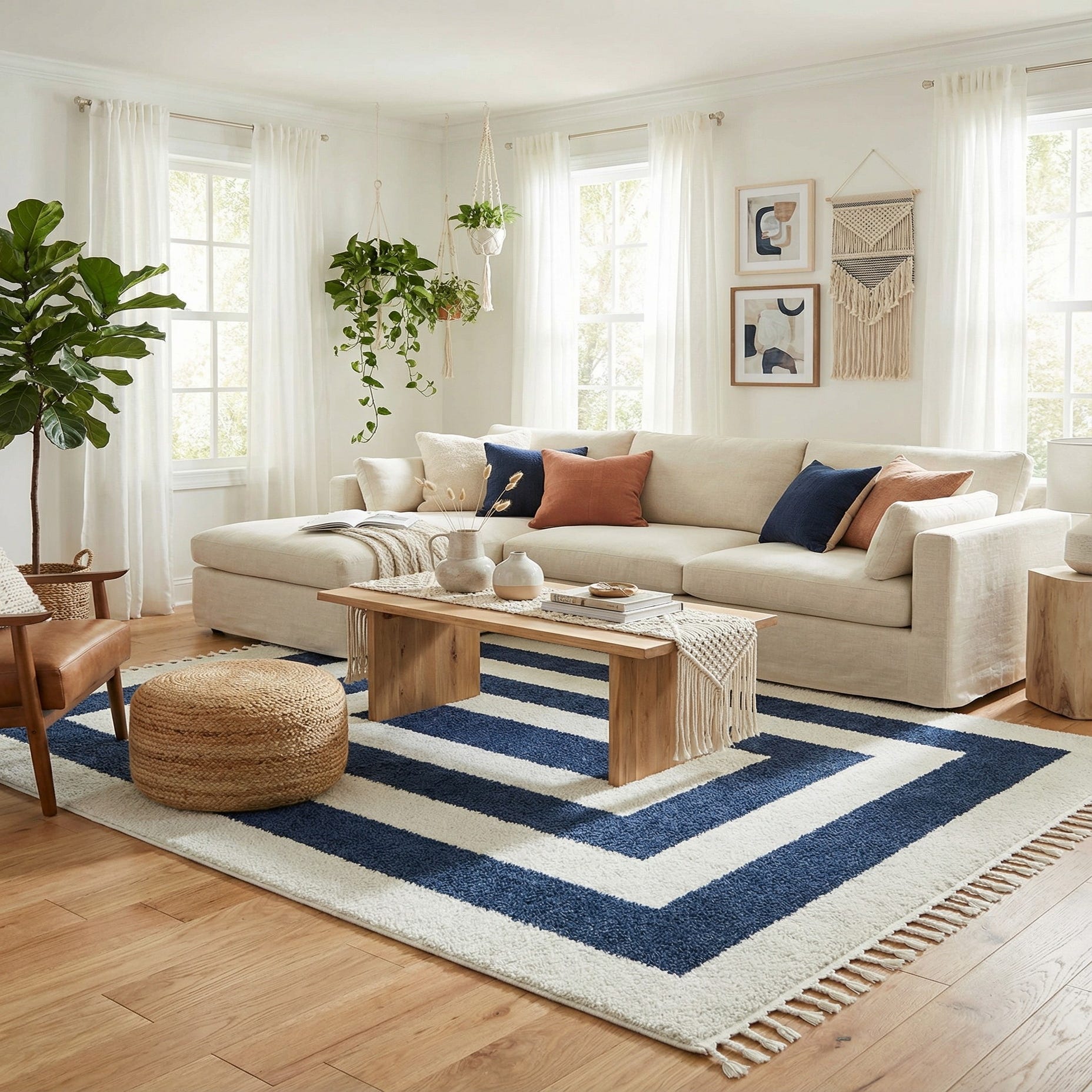 A 9x12 rectangular indoor rug featuring a modern geometric pattern of concentric navy blue and white stripes, with white fringe.