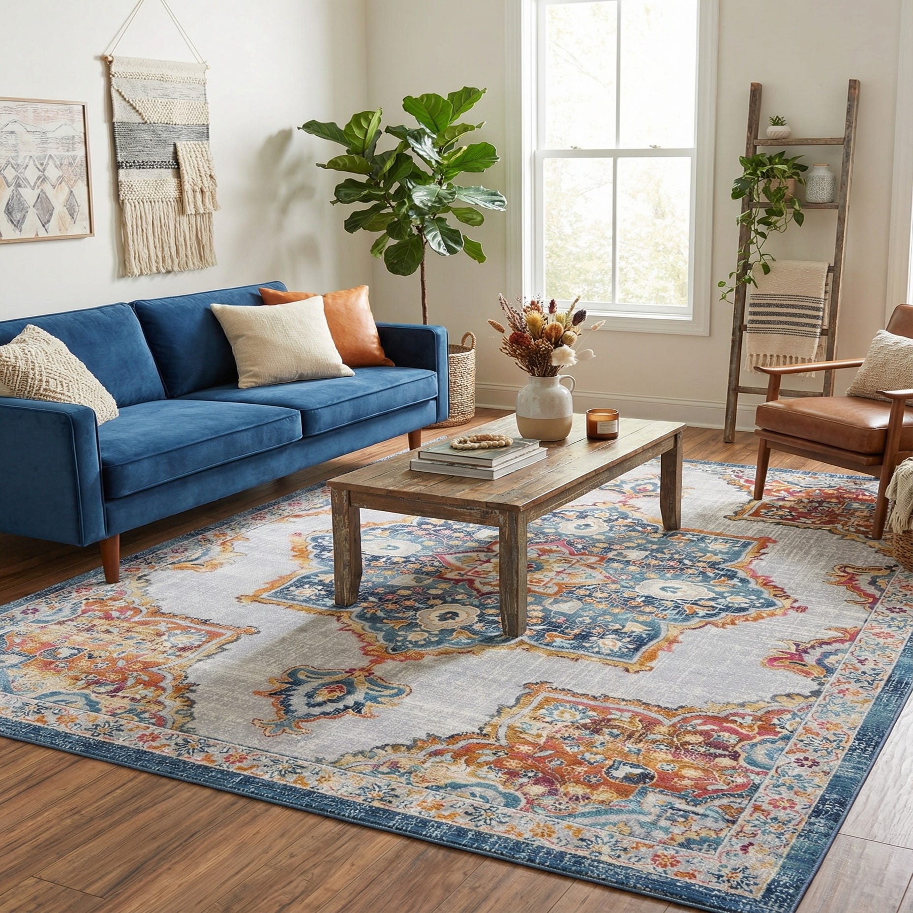 Place this rug to anchor a seating area, define an open-plan living space, or add pattern beneath a dining table. Its mix of cool blues with warm gold and orange accents pairs well with both traditional and transitional interiors—think navy sofas and warm wood furniture, linen upholstery and brass or rattan accents. It also complements eclectic and bohemian schemes where layered colors and textures are welcome, and it works equally well on hardwood, tile or layered over a larger neutral rug to add visual interest.