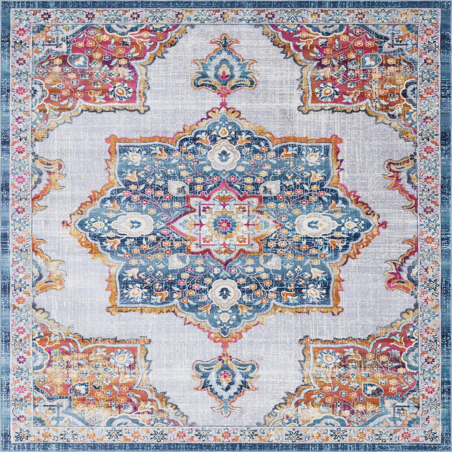 Primary color is Blue. Colors in this rug include: Blue, Gold, Gray, Navy Blue, Orange, Yellow, Pink, Ivory.