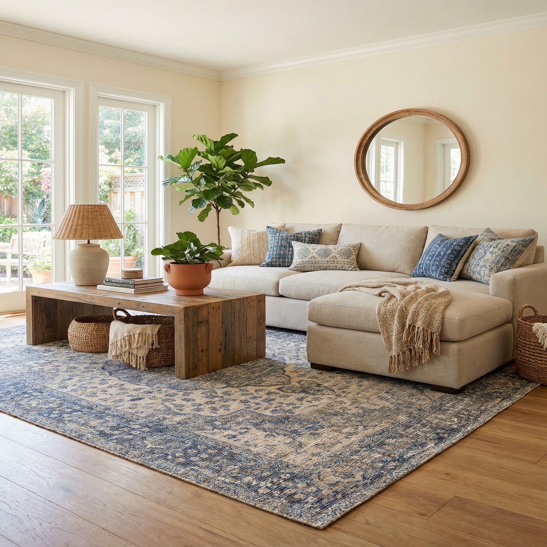 This rug is suitably versatile, fitting into various interior design scenarios. Its elegant pattern and color scheme work well in a living room, dining area, or bedroom, harmonizing with both modern minimalist decors and more eclectic style settings. For those who appreciate a touch of organic texture and a grounded, earthy color palette, this piece will integrate seamlessly into their space, lending itself to a calm and inviting atmosphere.