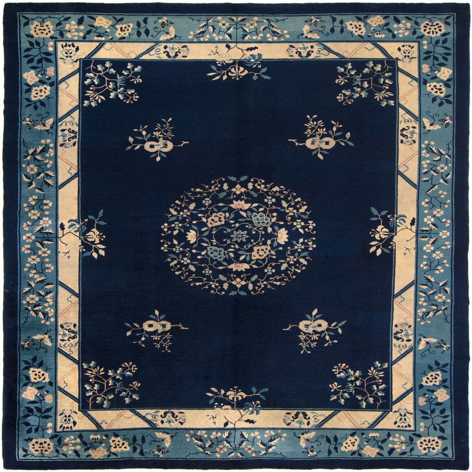 A 9x12 rectangular China Peking wool rug featuring a deep blue field with a central floral medallion and intricate light blue and beige borders.