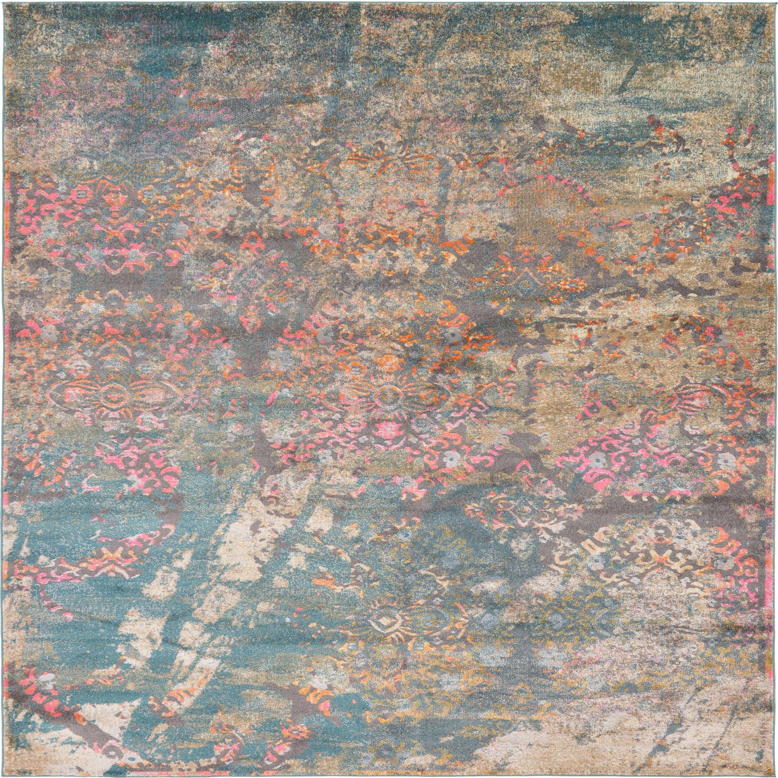 Primary color is Blue. Colors in this rug include: Blue, Beige, Orange, Purple, Pink, Yellow.