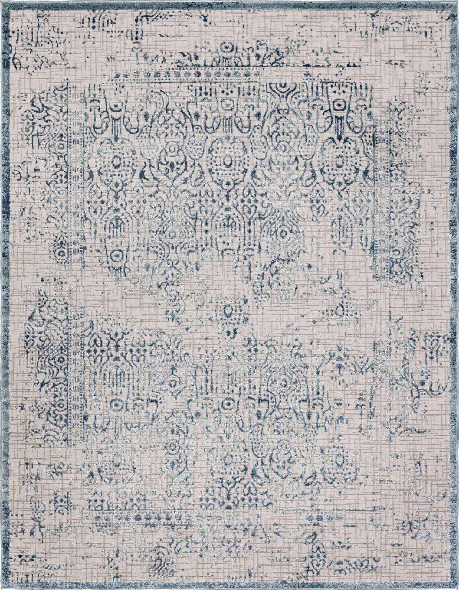 A softly distressed, medallion-inspired pattern sits over a subtle crosshatch ground, with beige and ivory motifs set against a blue background for a layered, lived-in look. The design balances ornamental detail with wear-through accents, giving the surface visual depth without heavy contrast. The machine-made construction produces a low-profile pile with a gently brushed hand — smooth to the touch with just enough texture where the pattern lifts.