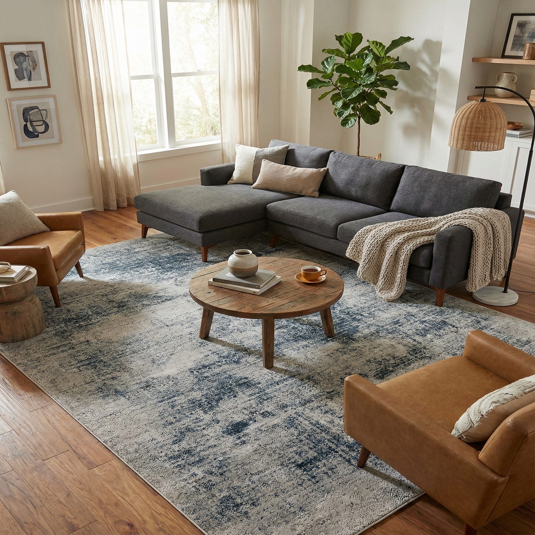 The Finsbury collection presents a 9x12 area rug with a modern abstract pattern that combines various shades of blue, ivory, and gray to create a versatile, visually dynamic floor covering. The blue background sets a calming tone, while the lighter hues add contrast and depth to the design. Crafted through a machine-woven process, the blend of 60% Polypropylene and 40% Polyester yields a texture that is soft to the touch and a surface that maintains a shed-free quality. Additionally, the rug is inherently stain-resistant, contributing to its durability and ease of maintenance.