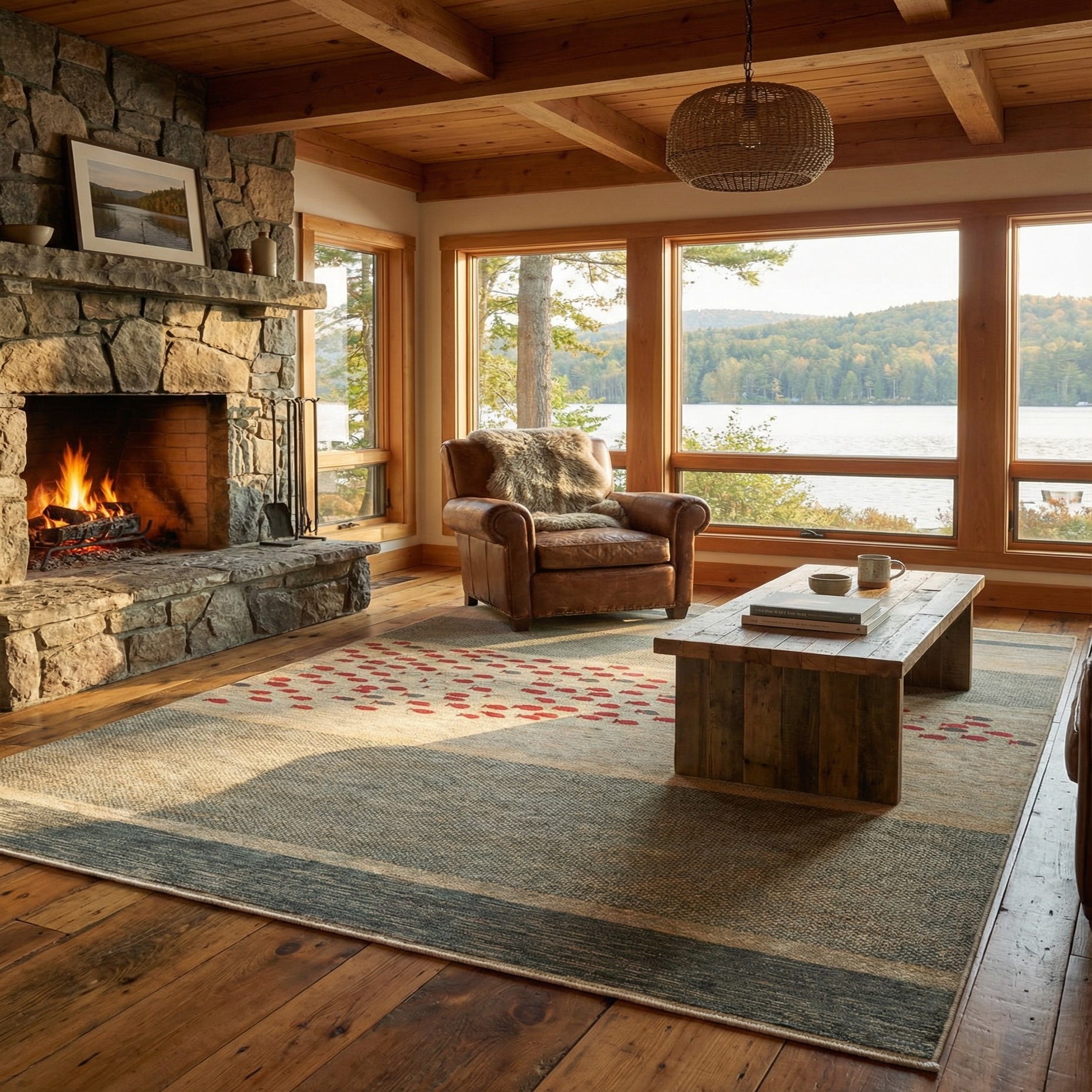 The palette and graphic layout work well in a variety of interiors. Pair it with natural wood furniture and linen upholstery for a relaxed coastal or casual contemporary living room, use it to anchor a seating group in a family room, or place it beneath a simple dining table to add color and rhythm to the space. It also complements mid?century pieces and transitional schemes when combined with navy or neutral accents and textured throws or pillows.
