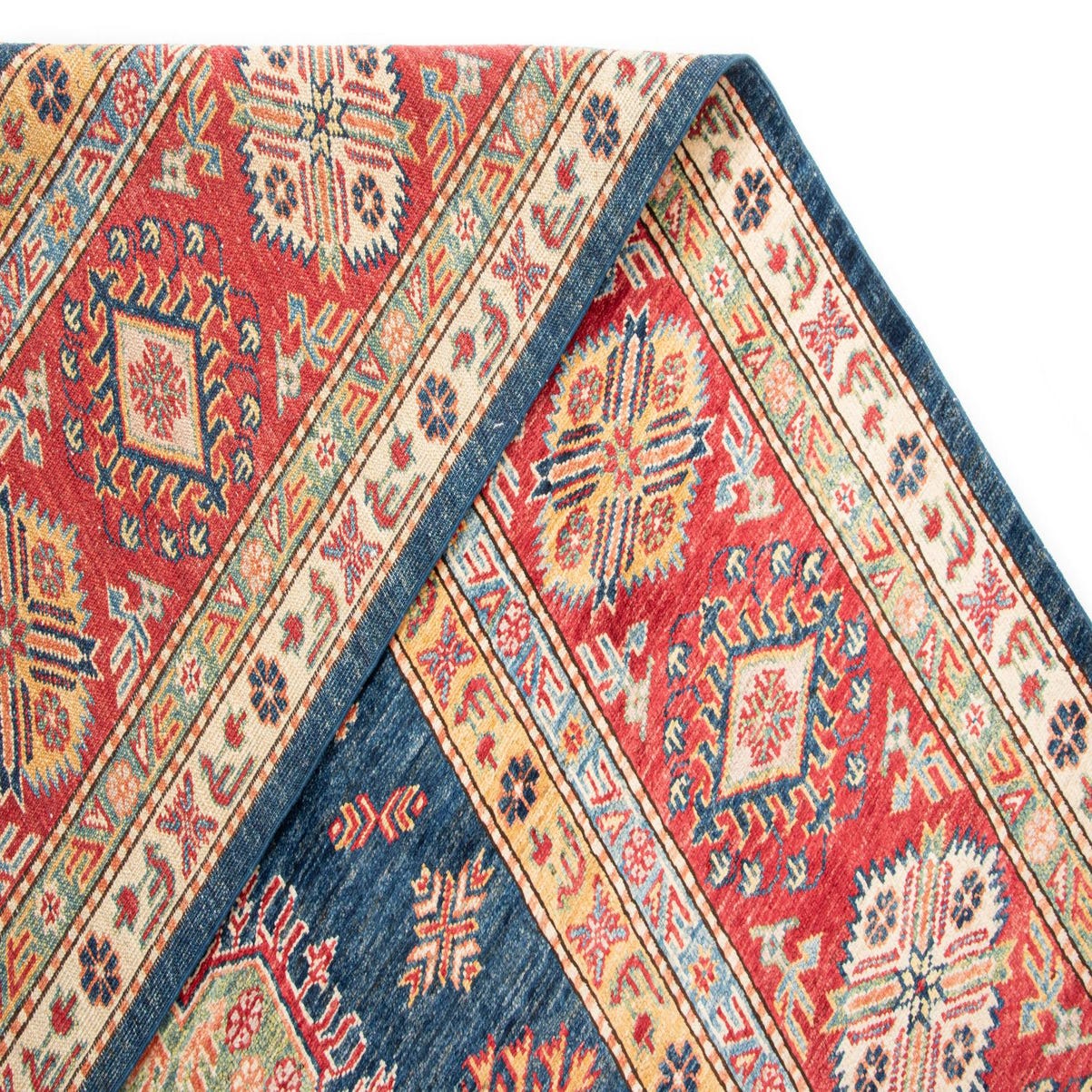 A 9x12 rectangular Rugs.com Kazak Persian rug with a deep blue field and intricate red, gold, and multi-colored traditional patterns.