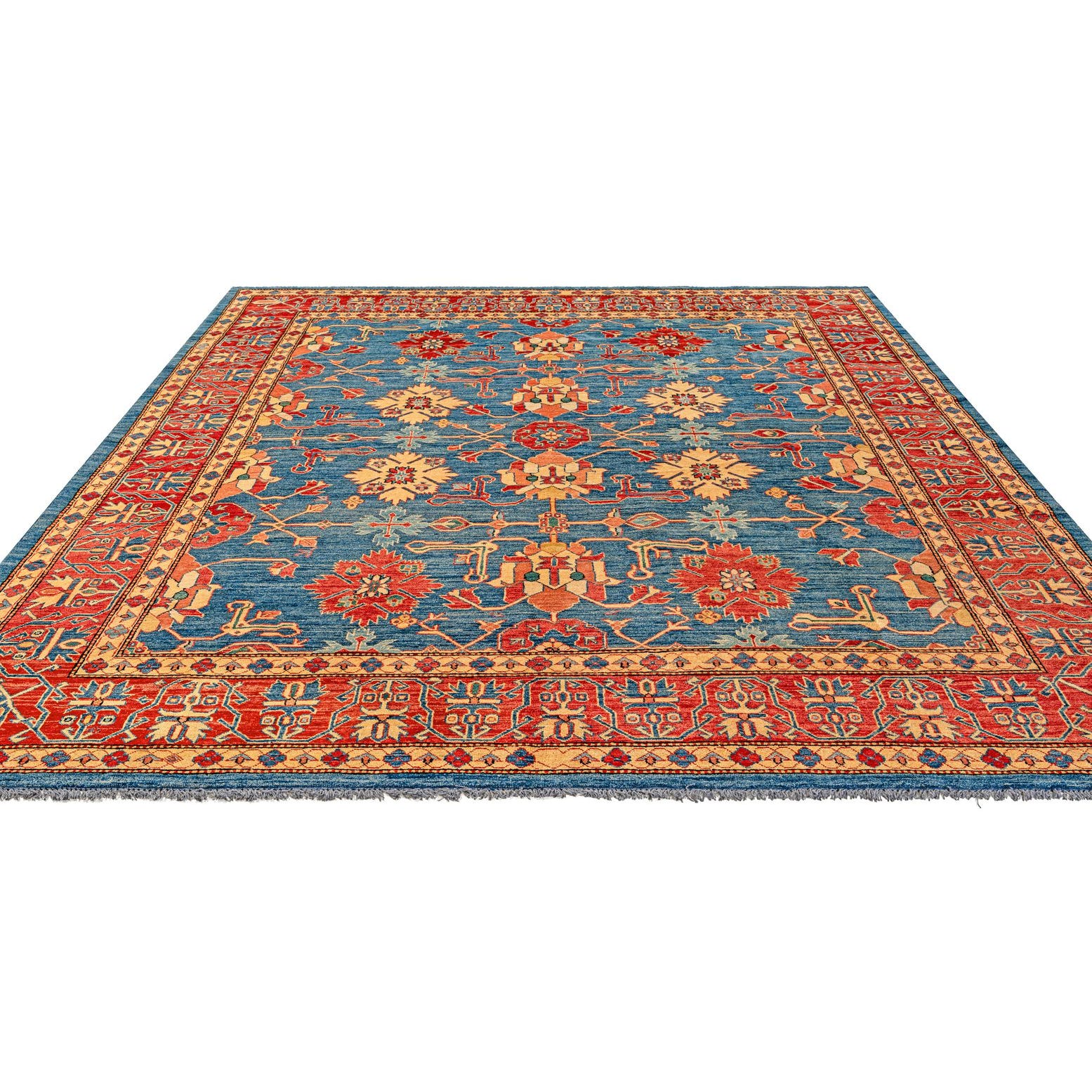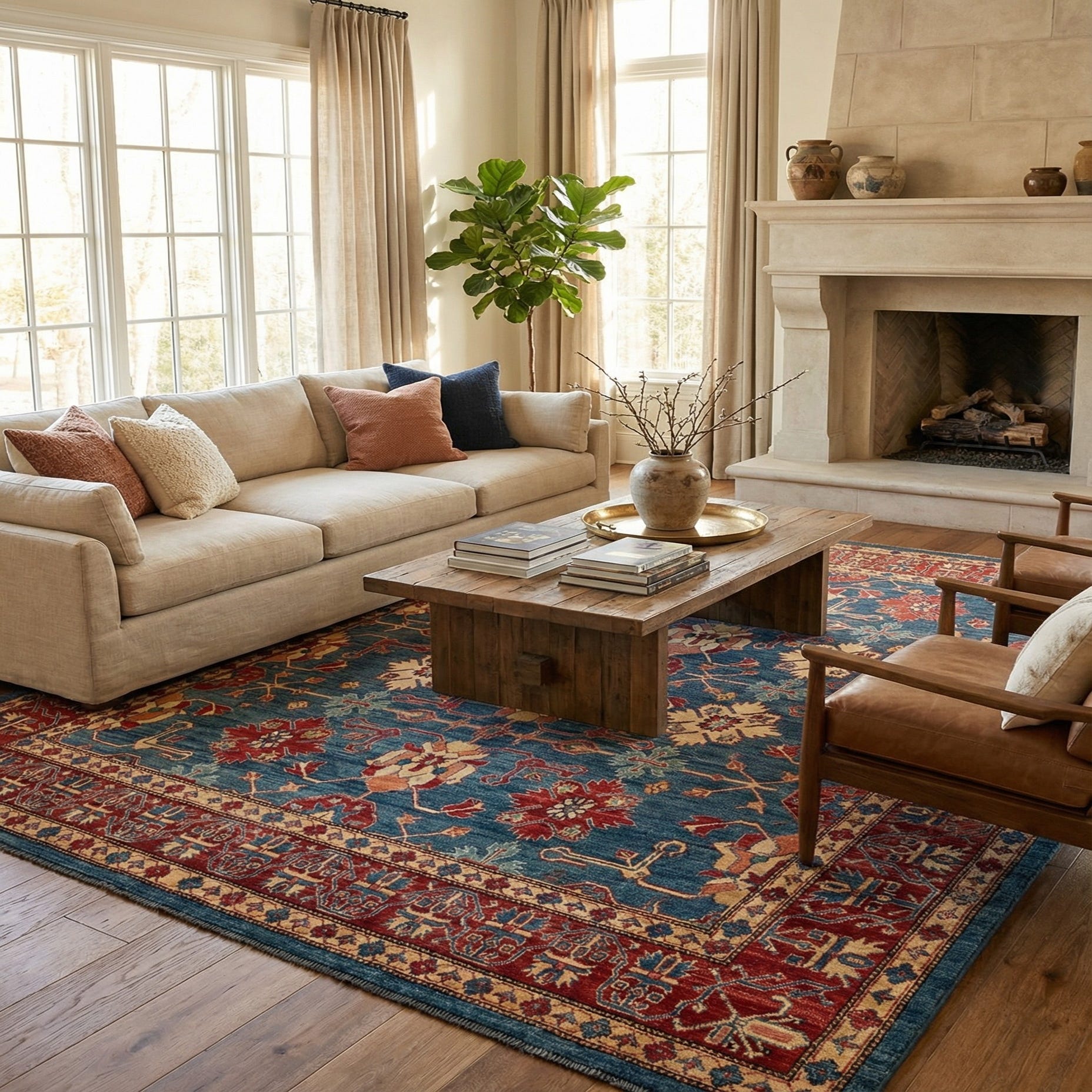 Hand-knotted from 100% wool, the surface has a dense, tactile pile that feels substantial underfoot and shows gentle tonal variation across the blue background. This rug will ground a living room seating area or formal dining space, pairing especially well with warm wood furniture, neutral upholstery, or brass and leather accents. It also works as a statement layer in eclectic or globally influenced interiors, where the mix of cool blue and warm red tones can both anchor and enliven the room.