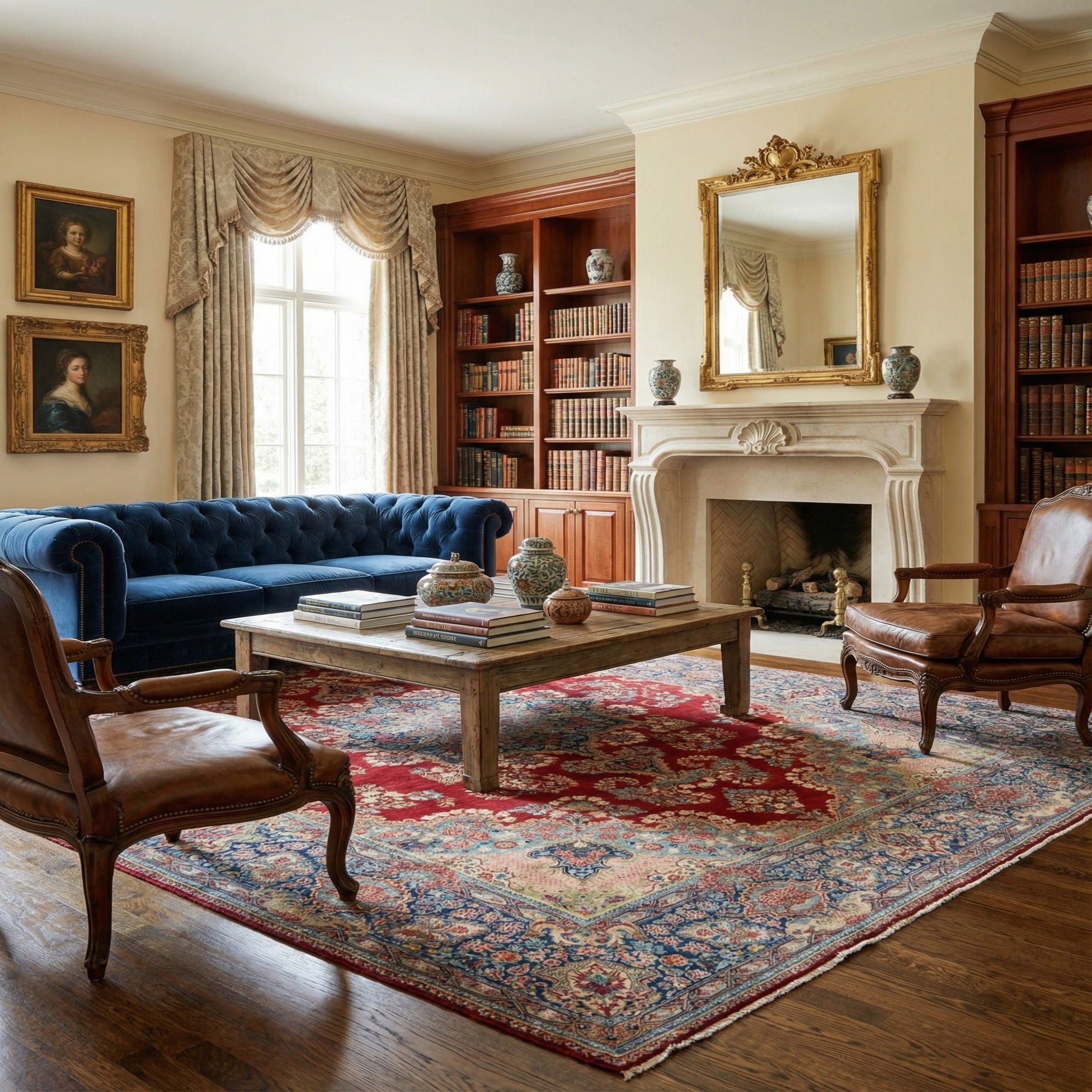 The rich color combination allows it to integrate smoothly with natural wood elements, antique furnishings, and a palette that includes complementary shades. This rug brings both visual interest and a sense of history to any interior space it graces.