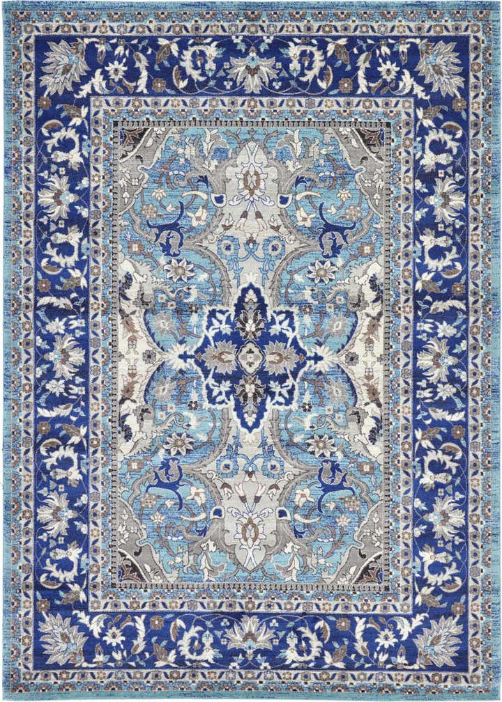 Primary color is Blue. Colors in this rug include: Blue, Black, Gray, Ivory, Navy Blue.