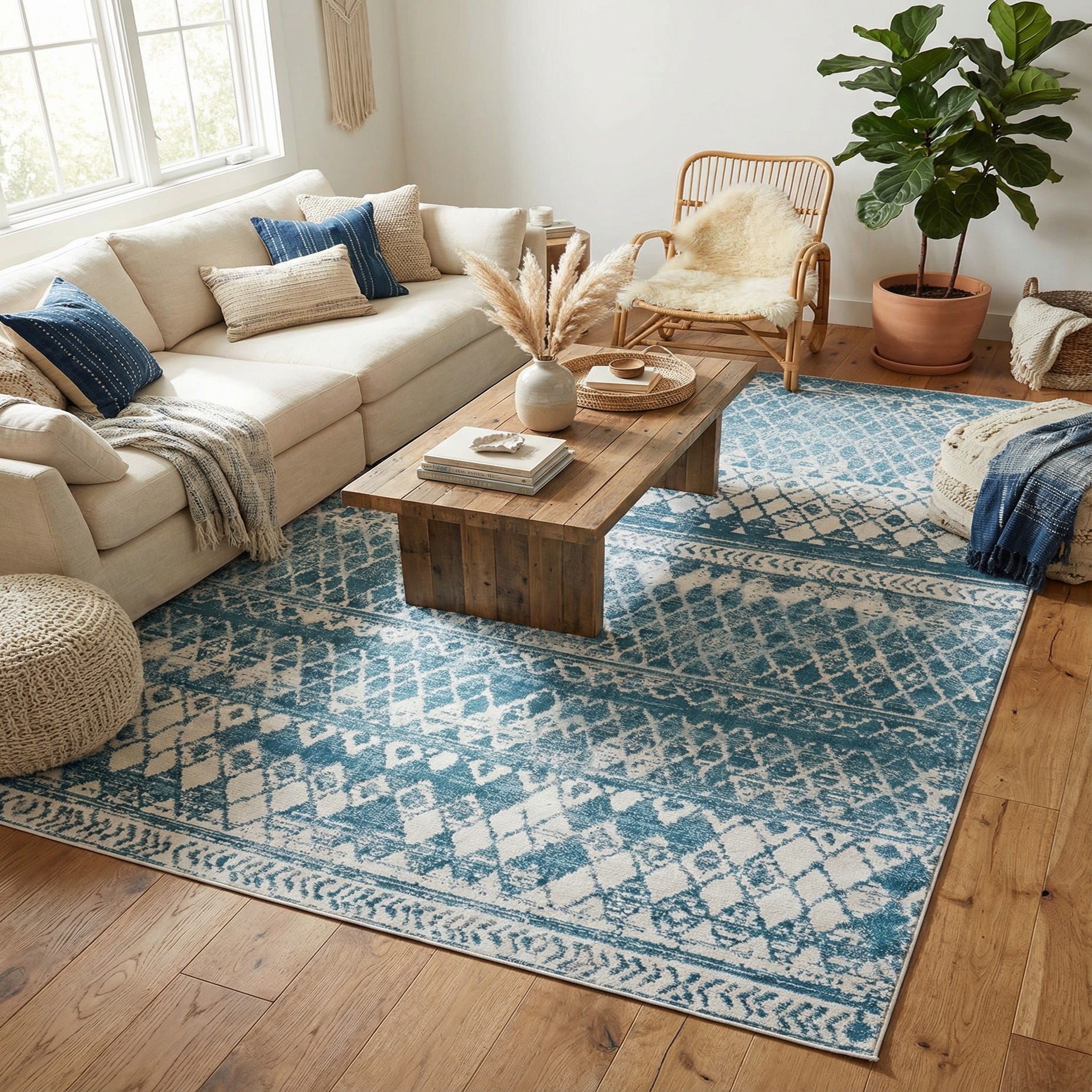 This rug works well anchoring a casual living room with light-wood furniture or a coastal-inspired sitting area where blue and ivory pair with crisp linens. It also fits nicely in a contemporary bedroom under the foot of the bed or layered in a modern farmhouse dining space to add pattern without overpowering the room. For a boho-chic look, layer it over a larger neutral rug and add textured pillows and woven accents for a cozy, collected feel.