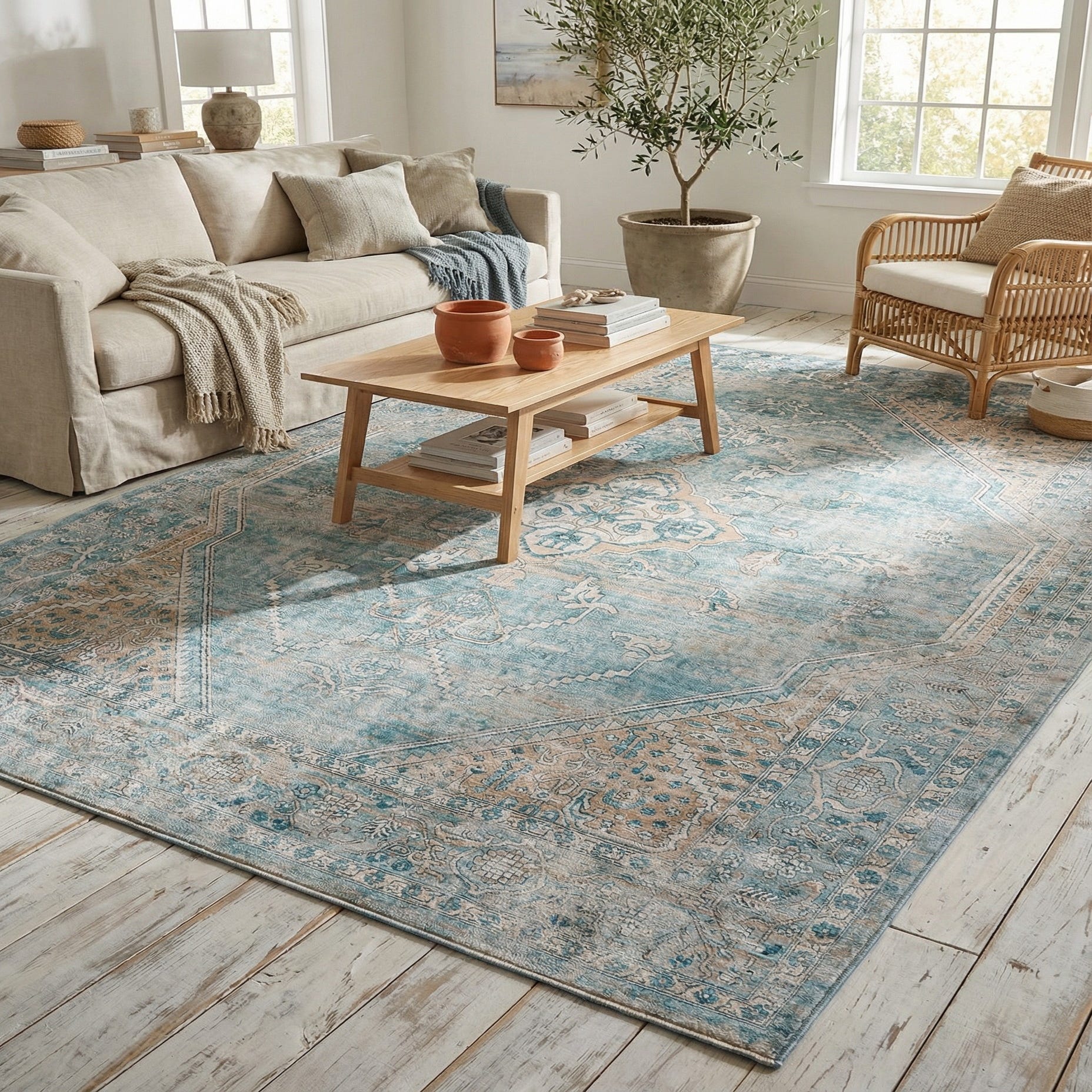 A cool blue field provides the backdrop for a traditional medallion layout framed by an angular octagonal inner border. Intricate floral and arabesque motifs in light blue and light brown weave through the center and corners, while a softly distressed finish mutes the contrast for a lived-in, vintage-inspired look. The pattern reads as classic and balanced, with enough open space in the field to let furniture and room elements breathe.