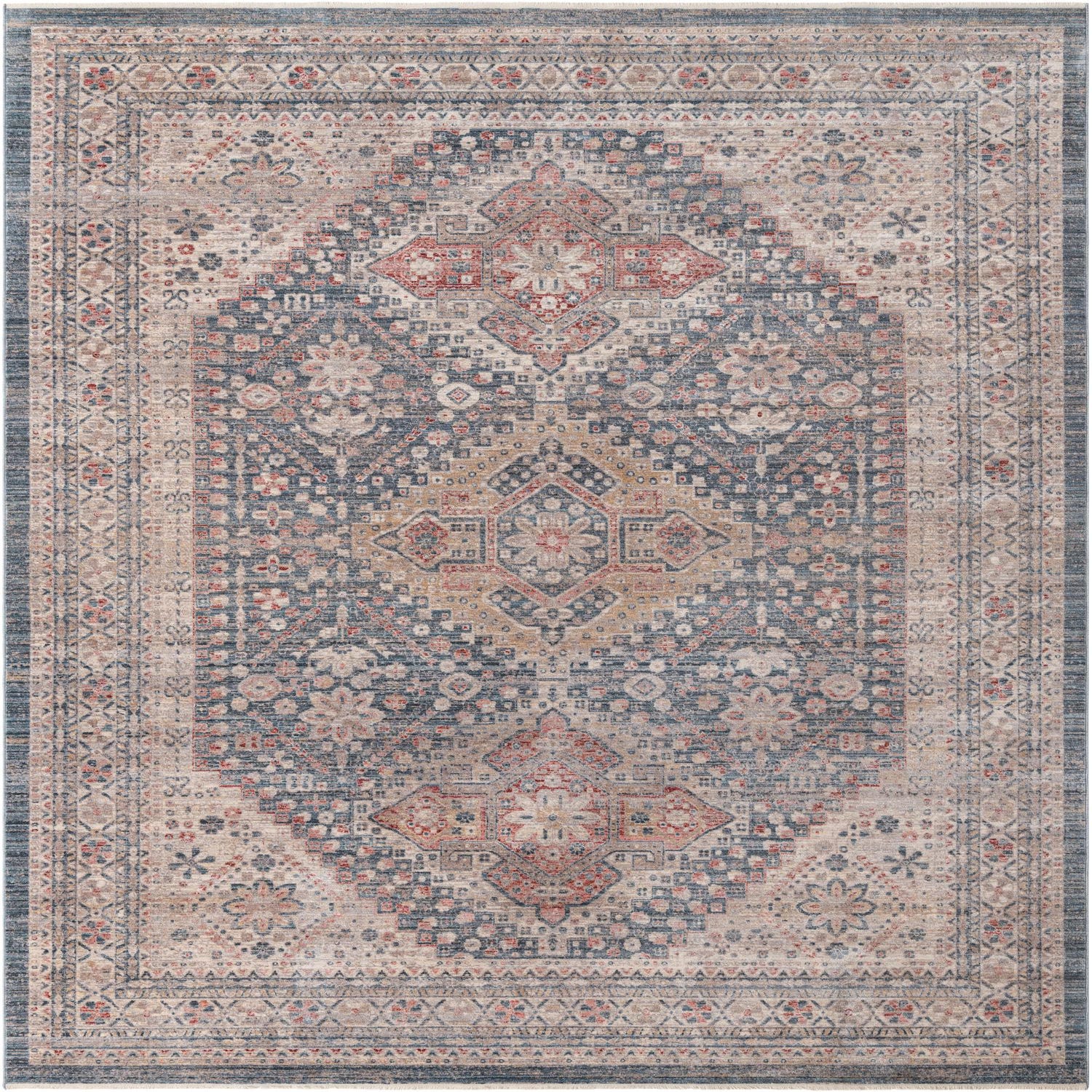 A central medallion and layered borders define a classic, vintage-inspired layout with a stepped geometric field and scattered floral motifs. The background is blue, while washes of beige, ivory and gray soften the overall look and create subtle contrast; small accents of red and pink add warmth and visual interest. The pattern has a gently distressed finish that gives the design an aged, lived-in character without heavy contrast.