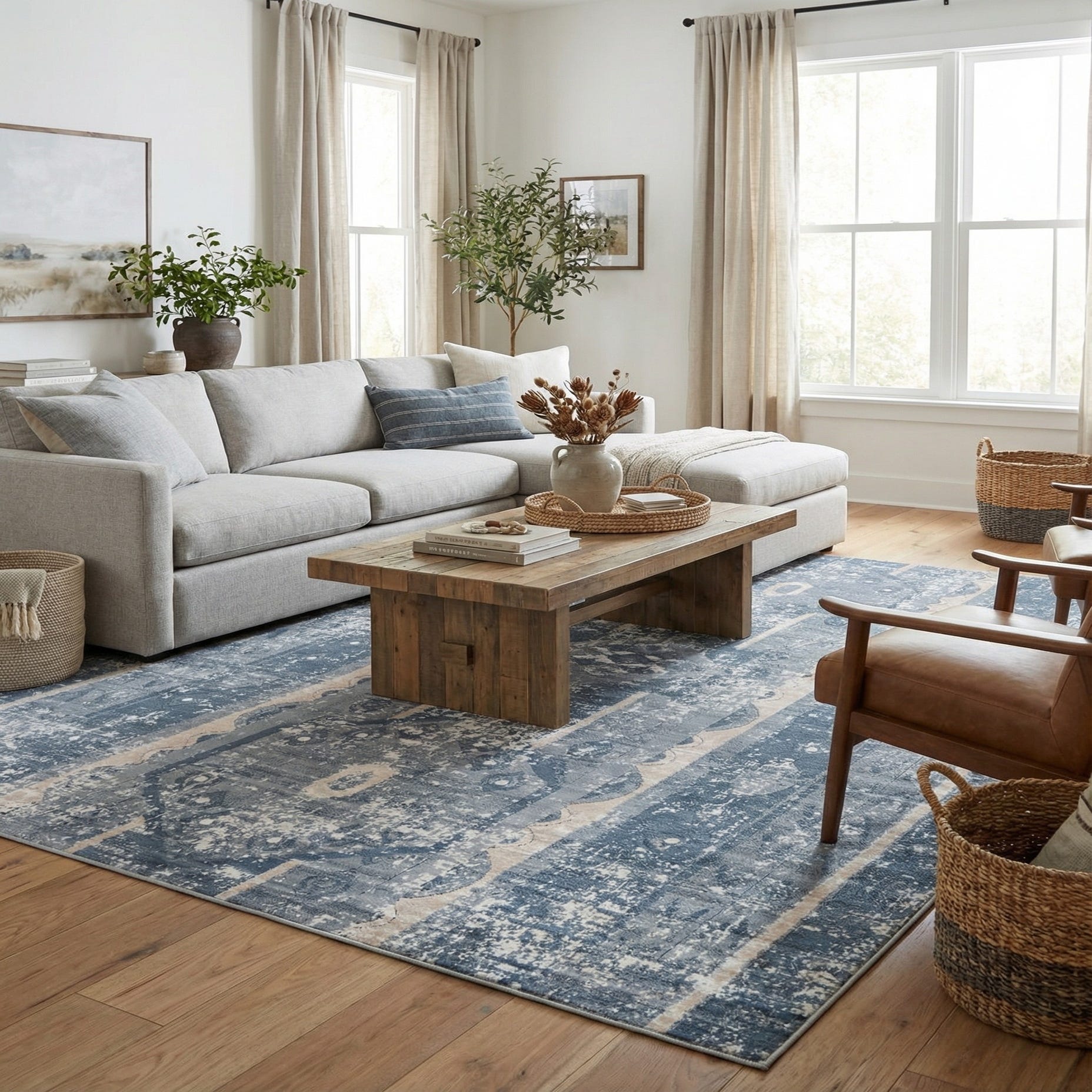 Machine-made from 85% polypropylene and 15% polyester, the rug has a low-profile pile with a smooth, slightly lustrous hand that lies flat beneath furniture. Its color palette and worn aesthetic work well in coastal and transitional interiors, casual modern living rooms, or a relaxed farmhouse dining area; it also pairs naturally with light woods, soft gray upholstery and crisp white trim. Use it to anchor a seating group, define a dining space, or add layered texture to a bedroom.