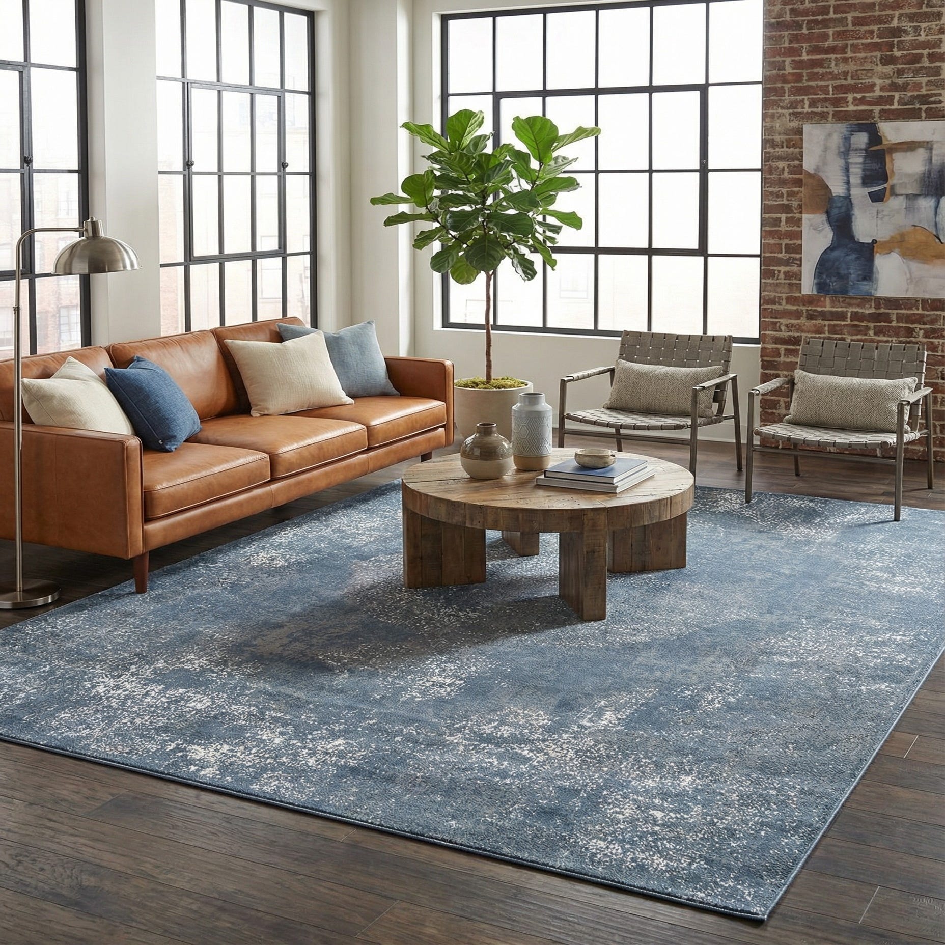 Place this piece in a living room beneath a low-profile sofa and coffee table to anchor seating, use it to add grounding contrast beneath a neutral bedroom set, or layer it in a home office to introduce texture and calm. It pairs well with light or medium wood tones, soft gray upholstery, and metallic accents like brushed nickel or aged brass, bringing a quiet, contemporary-vintage mood to transitional, coastal, or modern farmhouse interiors.