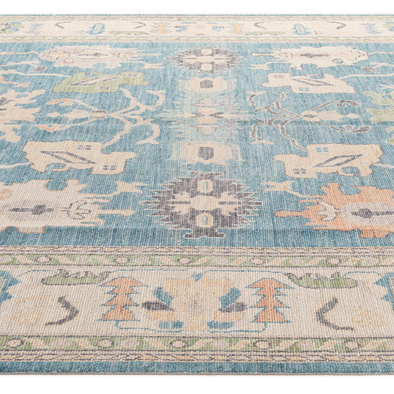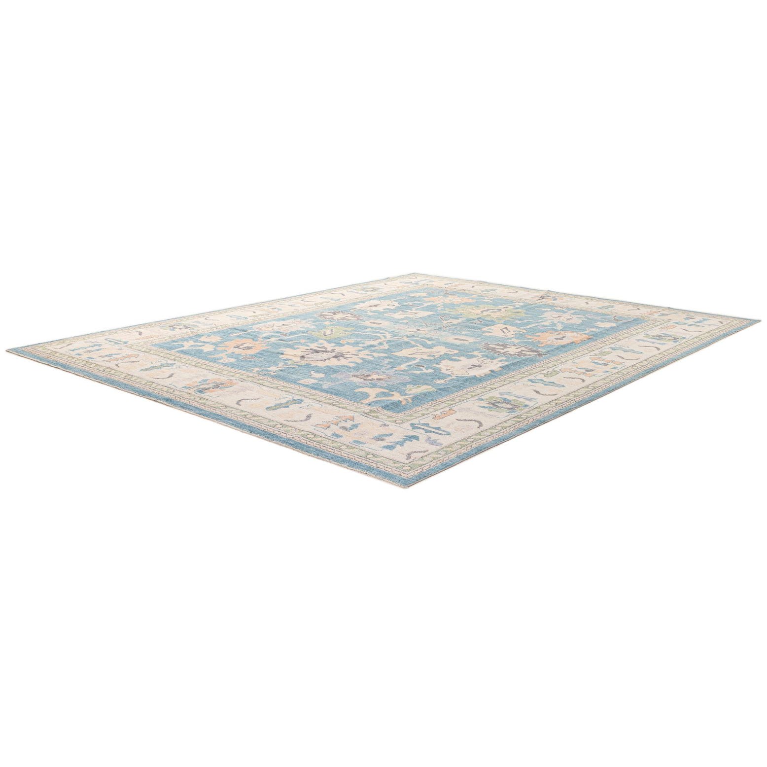 A 9x12 rectangular Oushak rug in shades of blue with a modern floral pattern and an ornate border.