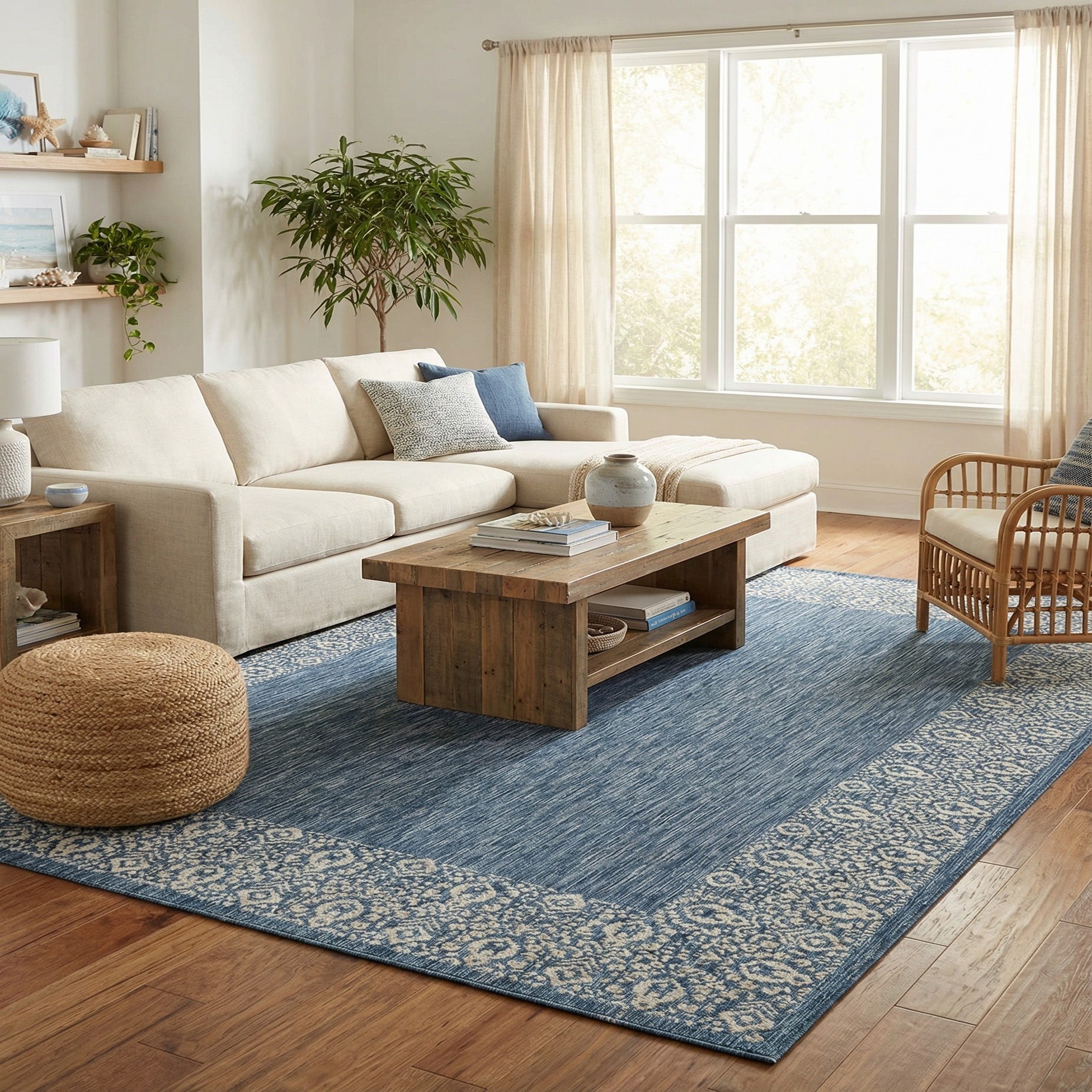 This rug pairs nicely with coastal and nautical palettes—think light woods, white slipcovered seating, or navy cushions—and also complements modern farmhouse or transitional décor when layered under a dining table or in a covered patio seating area. Its composed patterning makes it a good anchor for an outdoor dining set, sunroom arrangement, or a relaxed living space where you want clear lines and subtle pattern without a heavy look.